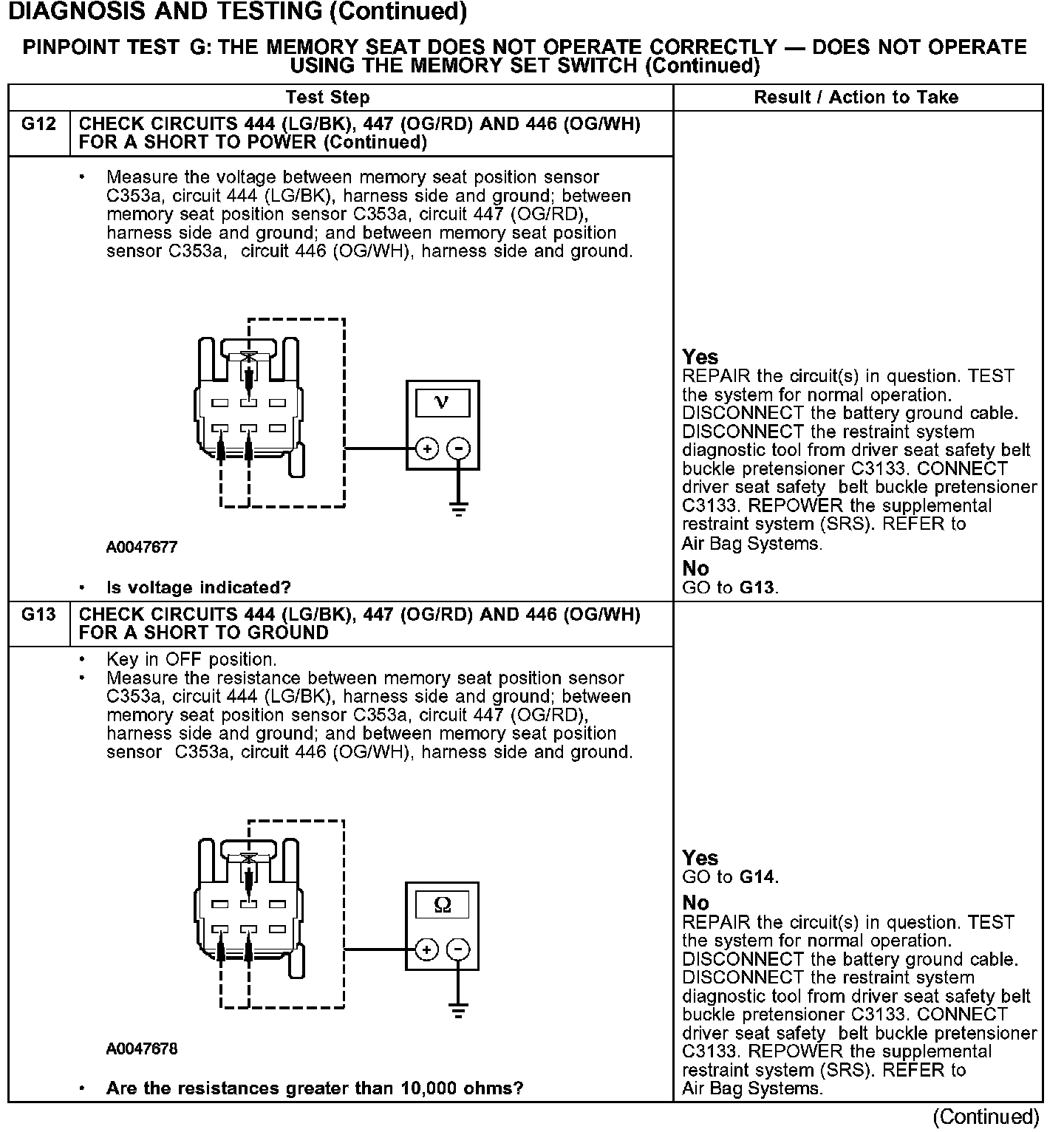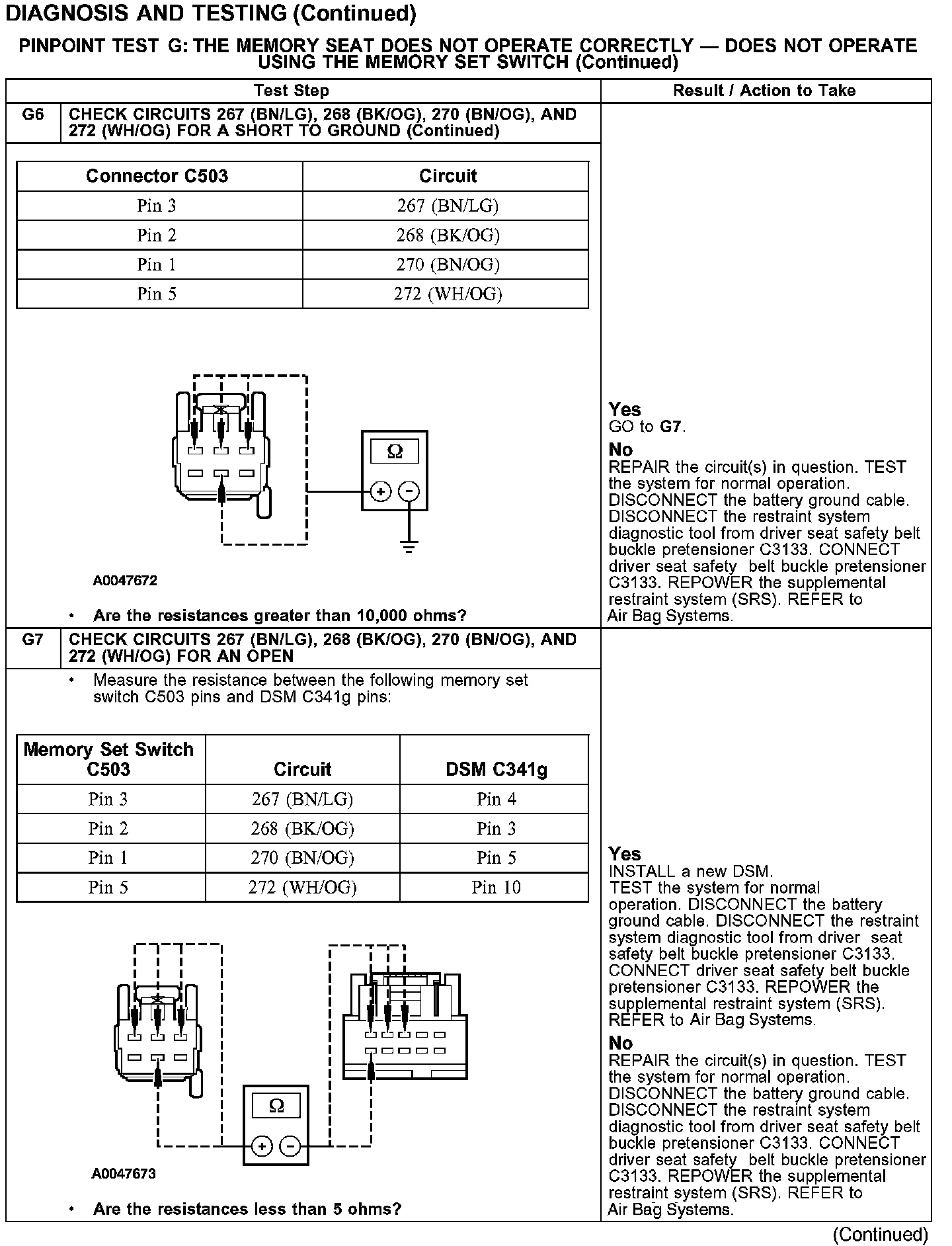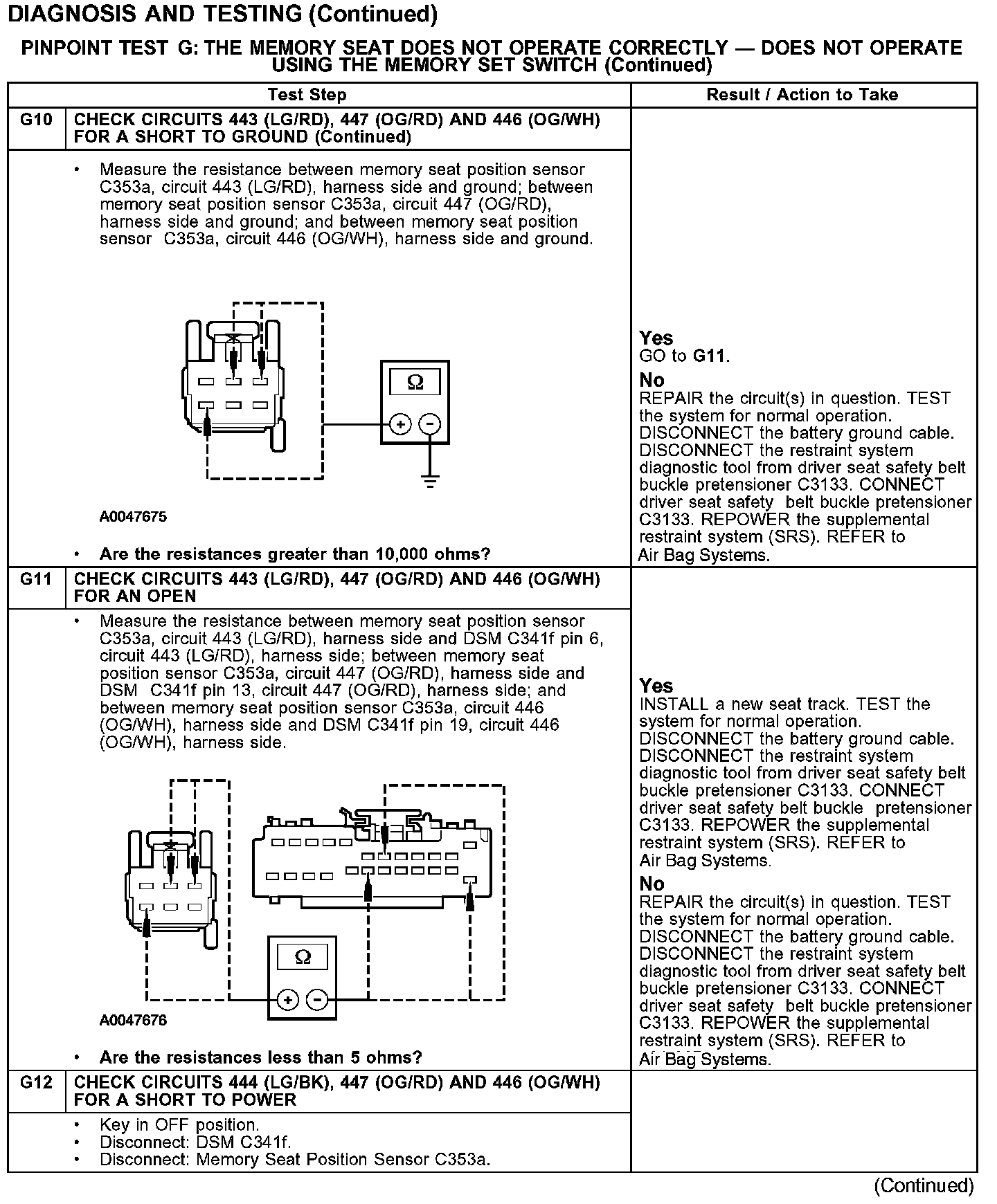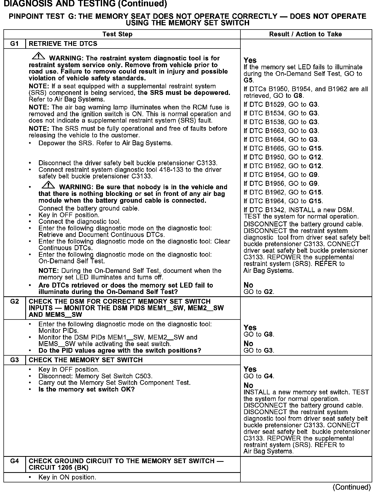 PINPOINT TEST G: THE MEMORY SEAT DOES NOT OPERATE CORRECTLY - DOES NOT OPERATE USING THE MEMORY SET SWITCHG1-G4: