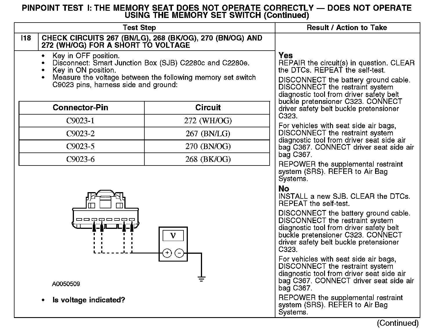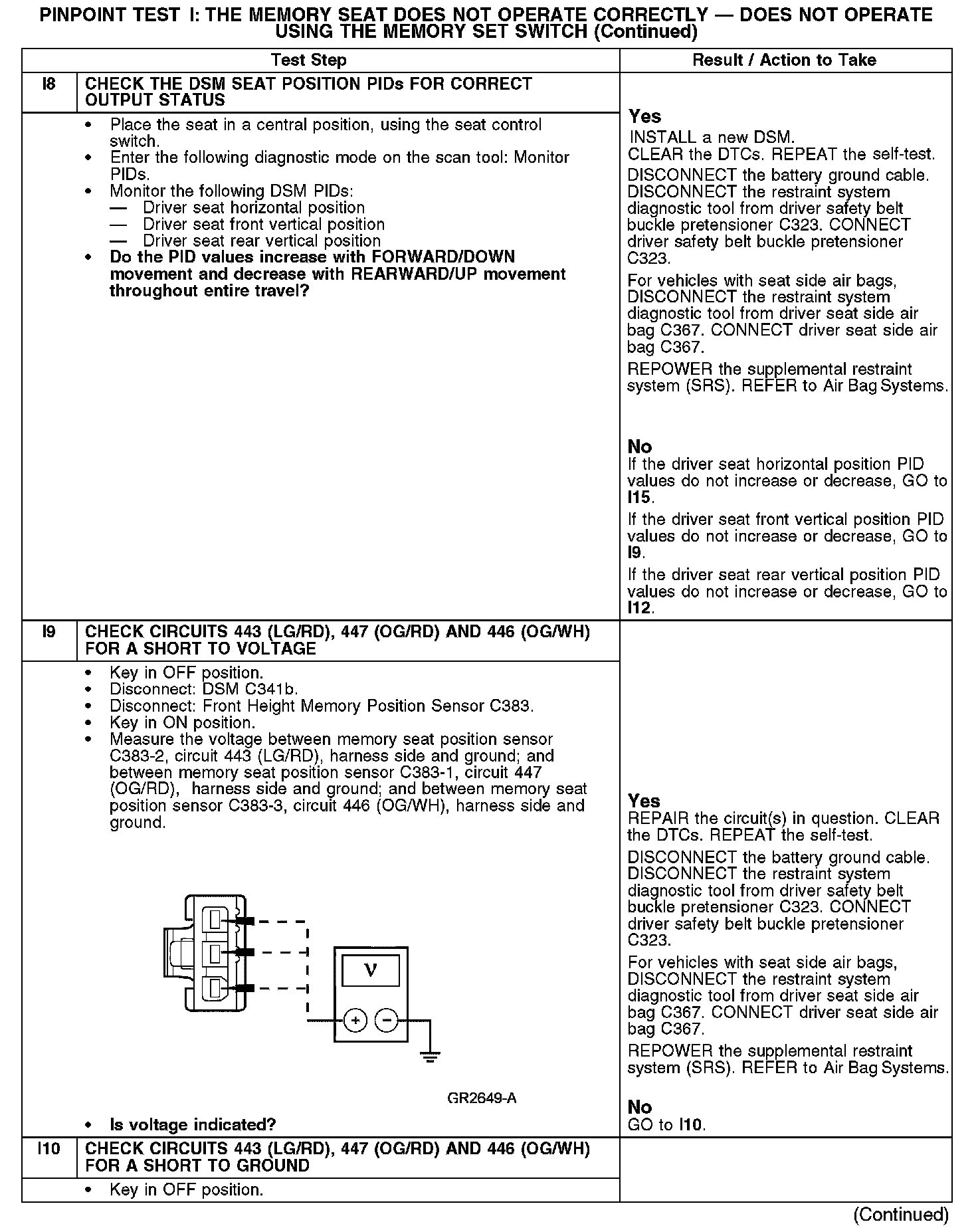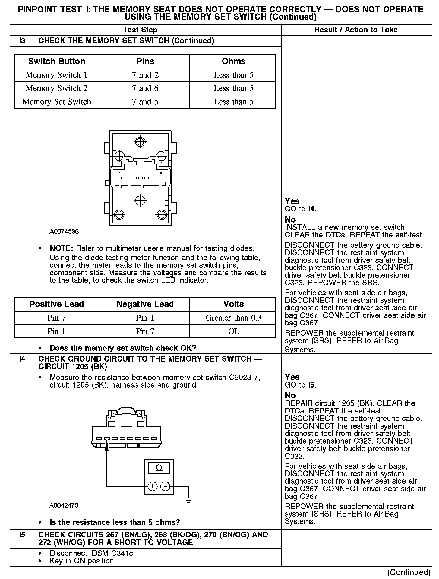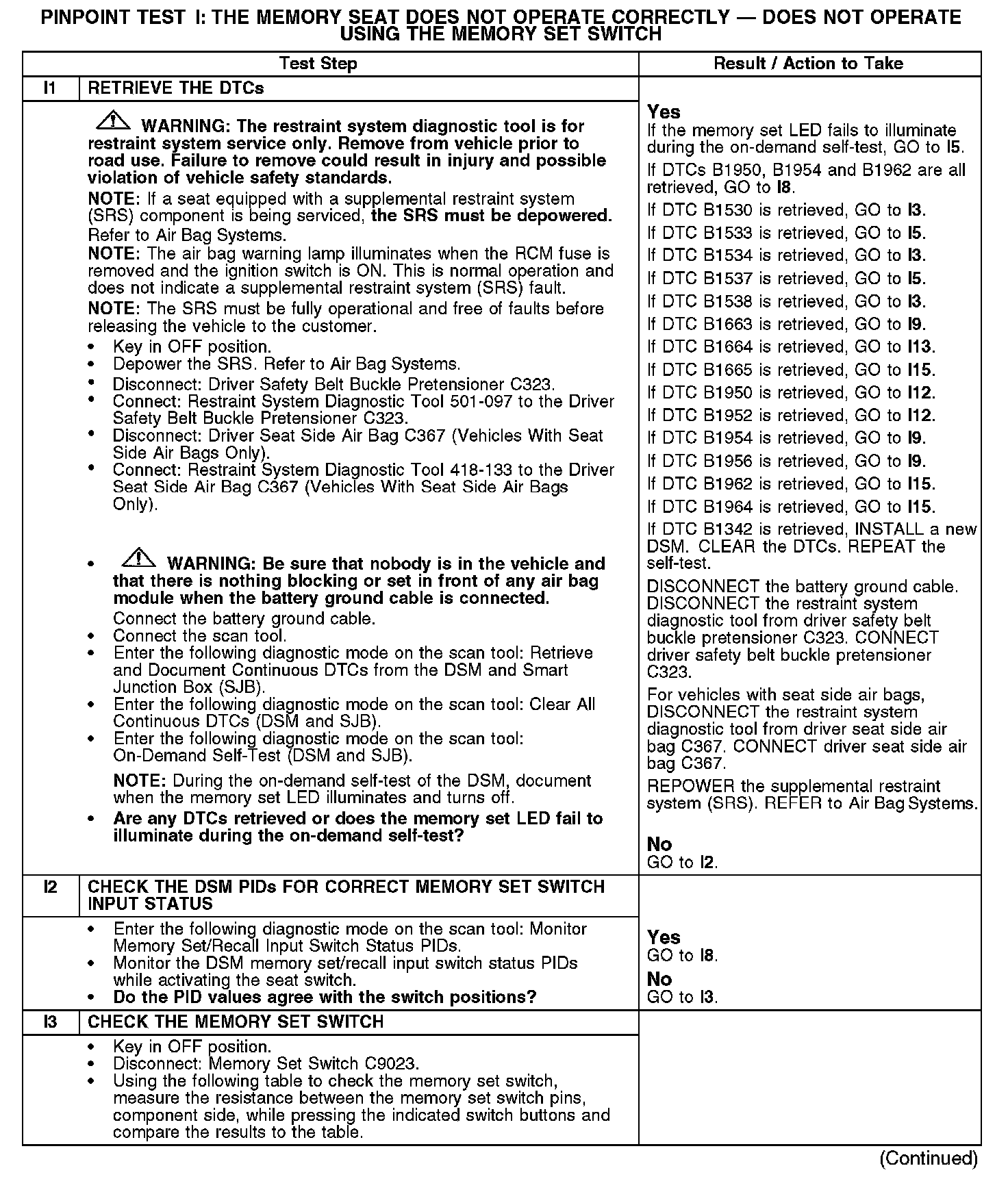PINPOINT TEST I: THE MEMORY SEAT DOES NOT OPERATE CORRECTLY - DOES NOT OPERATE USING THE MEMORY SET SWITCHI1-I3: