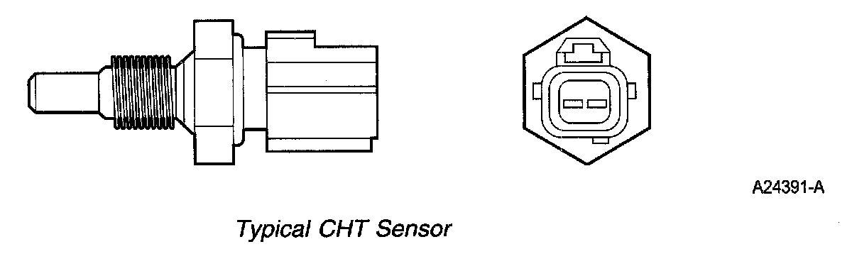 The CHT sensor is a thermistor device in which resistance changes with the temperature. The electrical resistance of a thermistor decreases as temperature increases., and the resistance increases as the temperature decreases. The varying resistance affects the voltage drop across the sensor terminals and provides electrical signals to the PCM corresponding to temperature.