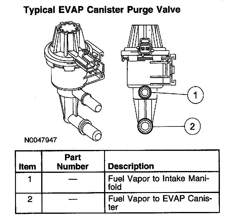 The EVAP canister purge valve is part of the enhanced EVAP system that is controlled by the PCM. This valve controls the flow of vapors (purging) from the EVAP canister to the intake manifold during various engine operating modes. The EVAP canister purge valve is a normally closed valve. The EVAP canister purge valve controls the flow of vapors by way of a solenoid, eliminating the need for an electronic vacuum regulator and vacuum diaphragm. The PCM outputs a signal between 0 mA and 1,000 mA to control the EVAP canister purge valve.