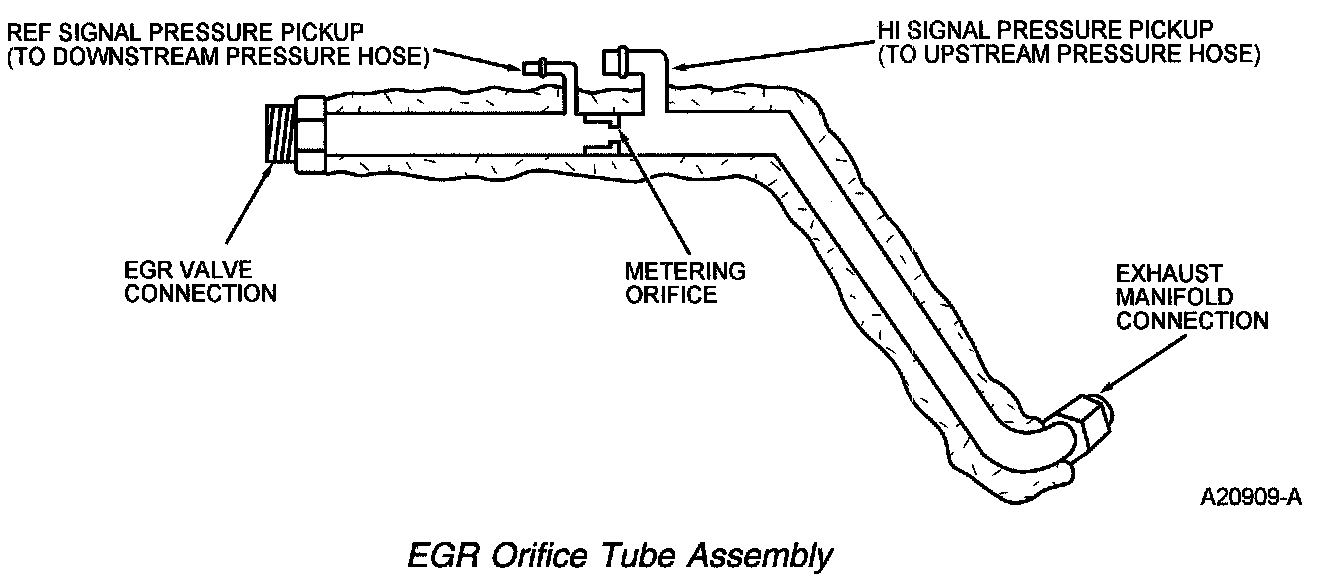 The orifice tube assembly is a section of tubing connecting the exhaust system to the intake manifold. The assembly provides the flow path for the EGR to the intake manifold and also contains the metering orifice and 2 pressure pick-up tubes. The internal metering orifice creates a measurable pressure drop across it as the EGR valve opens and closes. This pressure differential across the orifice is picked up by the differential pressure feedback EGR sensor which provides feedback to the PCM.