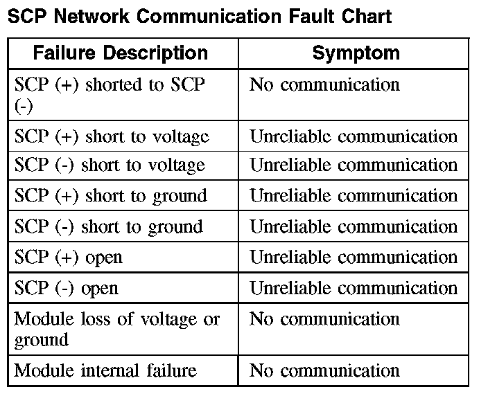 The SCP network uses an unshielded twisted pair cable of data (+) and data (-) circuits. The data (+) circuit is regulated to approximately .5 volts and the data (-) circuits to approximately 4.5 volts during neutral or rested network traffic. Voltage on data circuits increases/decreases as bus messages are sent. Multiple bus messages can be sent over the network SCP circuits allowing network modules to communicate with each other. The SCP network operates at a maximum data transfer speed of 41.6 Kbps and remains operational at a degraded level if one of the bus wires becomes open or shorted to ground or voltage.