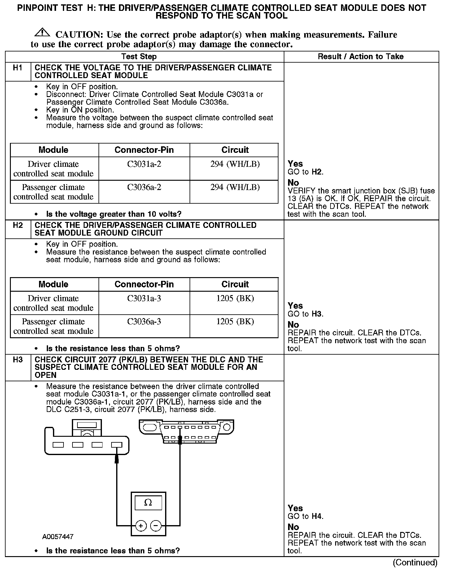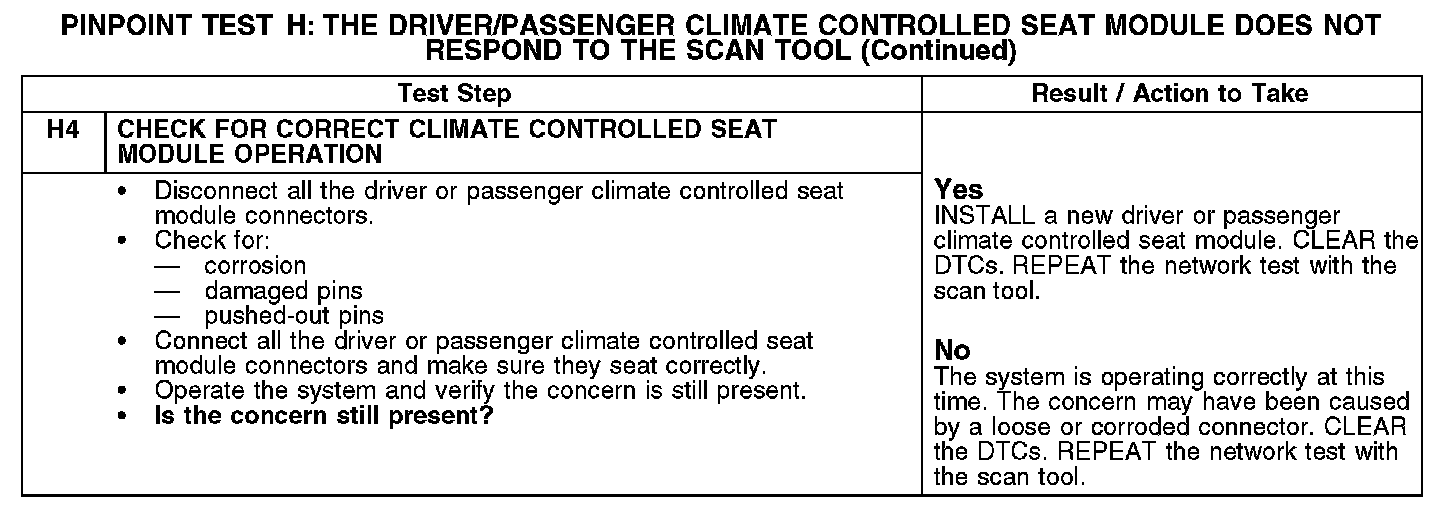 PINPOINT TEST H: THE DRIVER/PASSENGER CLIMATE CONTROLLED SEAT MODULE DOES NOT RESPOND TO THE SCAN TOOL.H1-H3: