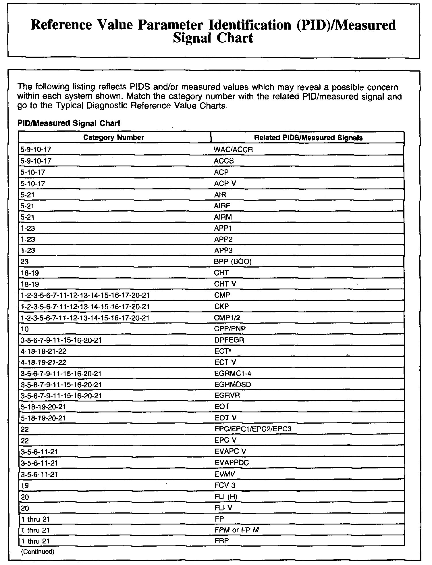 Reference Value Parameter Identification (PID)/Measured Signal Chart (Part 2):