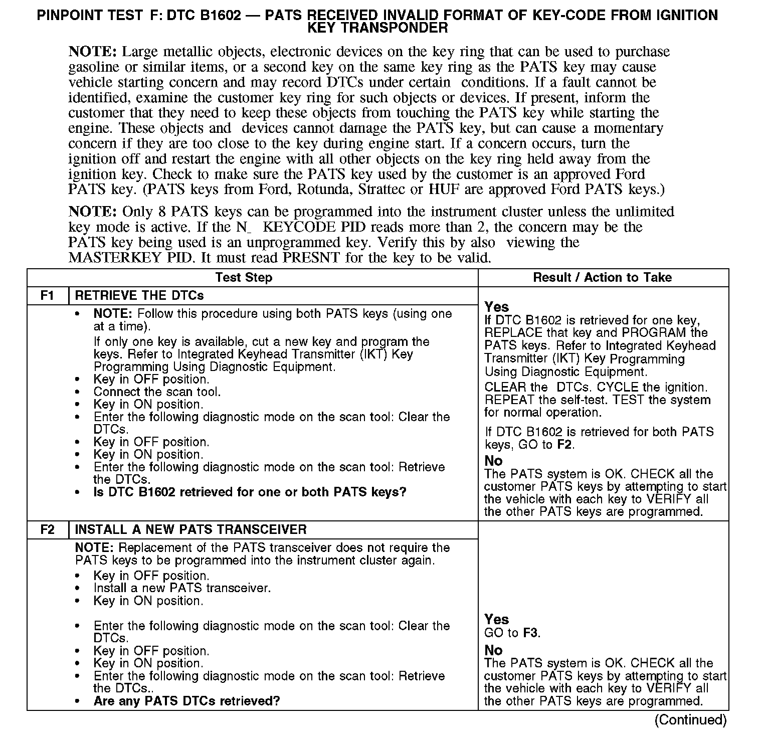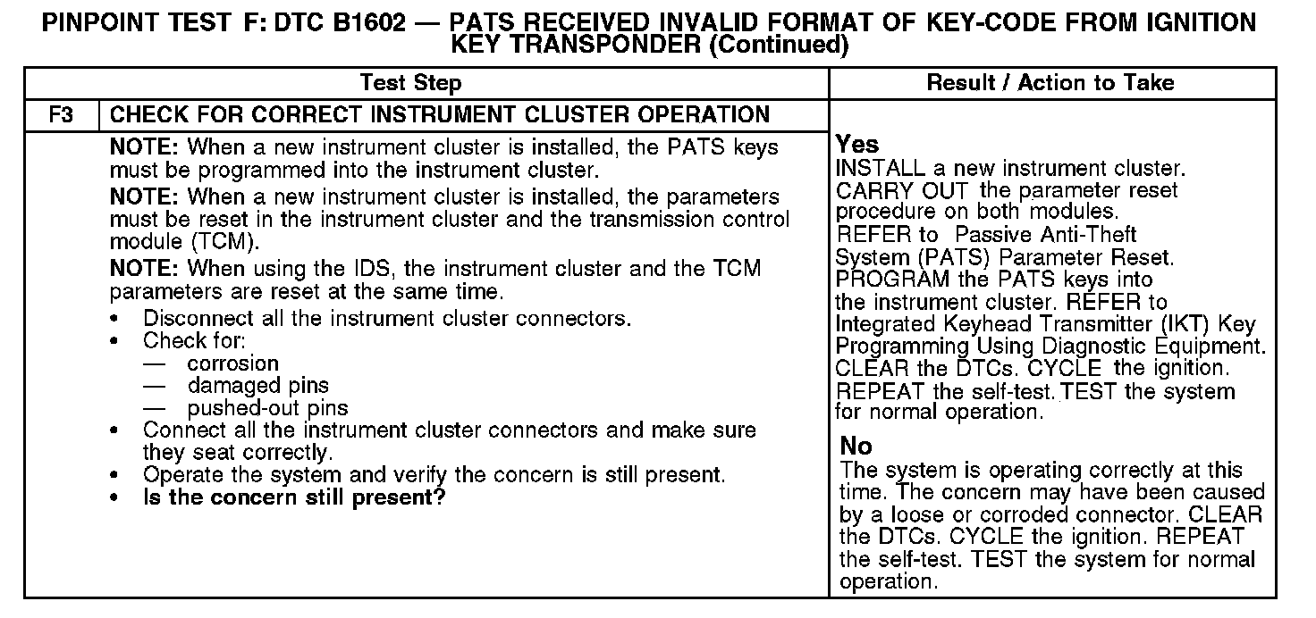 Test F: DTC B1602 - PATS Received Invalid Format Of Key-Code From Ignition Key Transponder