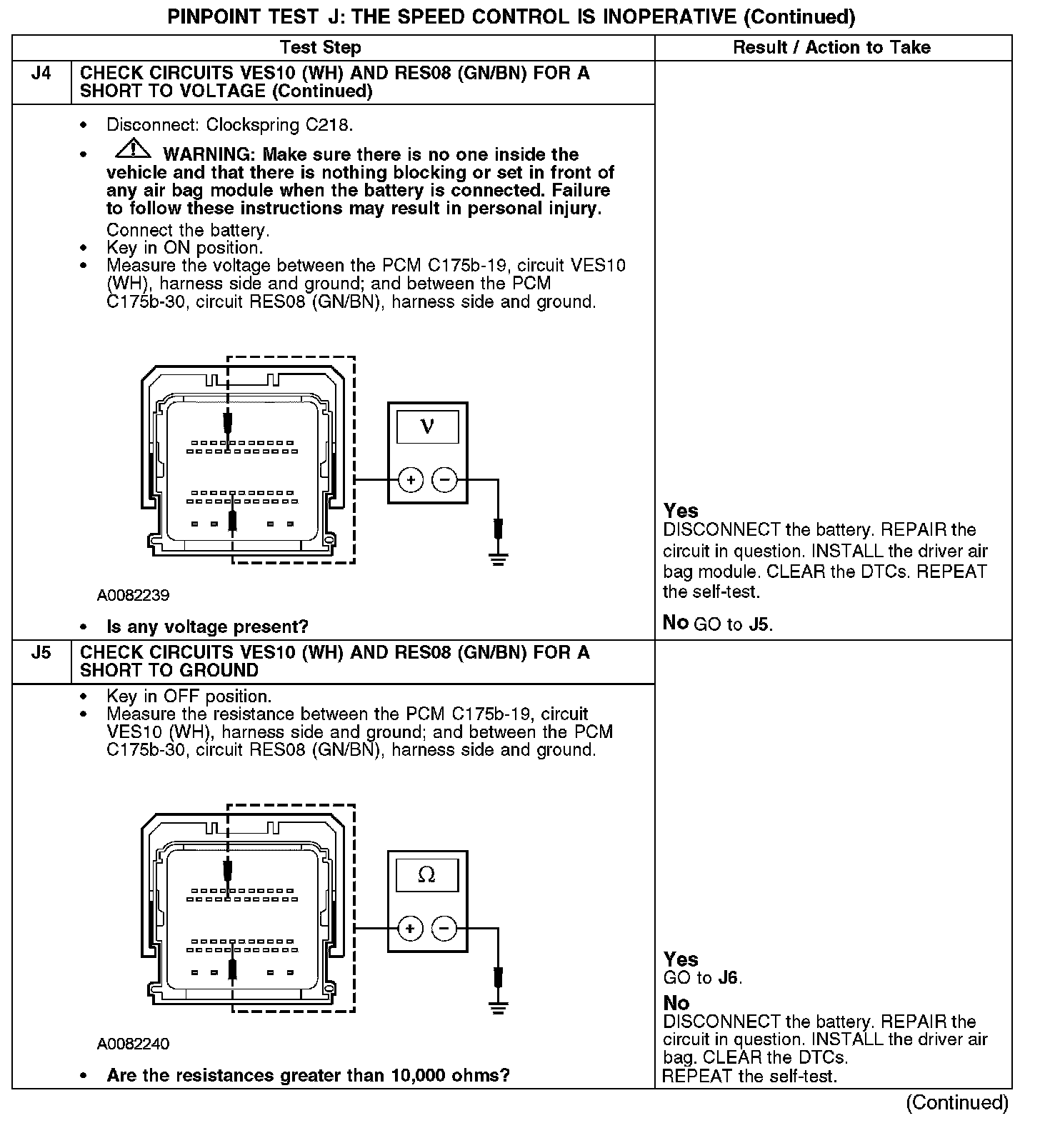 The PCM sends a signal through circuit VES10 (WH) to the speed control switches, which passes through the clockspring. The return signal is sent through circuit RES08 (GN/BN) and the clockspring.