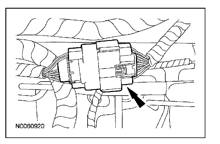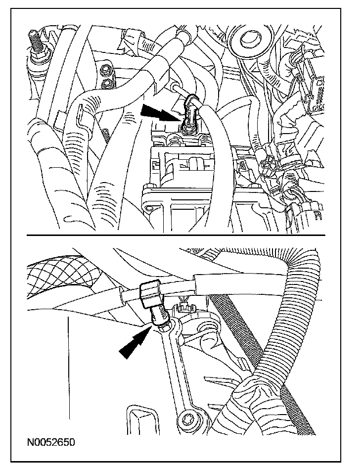 38. Connect the 2 low voltage electrical connectors and the engine harness-to-body harness retainer.