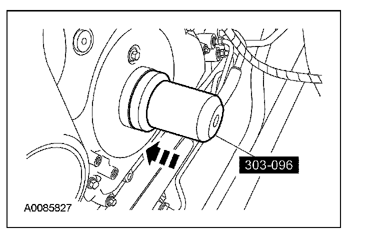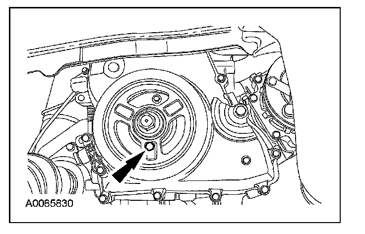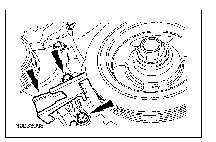 CAUTION: Do not loosen or remove the crankshaft pulley bolt without first installing the special tools as instructed in this procedure. The crankshaft pulley and the crankshaft timing sprocket are not keyed to the crankshaft. The crankshaft, the crankshaft sprocket and the pulley are fitted together by friction, using diamond washers between the flange faces on each part. For that reason, the crankshaft sprocket is also unfastened if you loosen the pulley bolt. Before any repair requiring loosening or removal of the crankshaft pulley bolt, the crankshaft and camshafts must be locked in place by the special service tools, otherwise severe engine damage can occur.