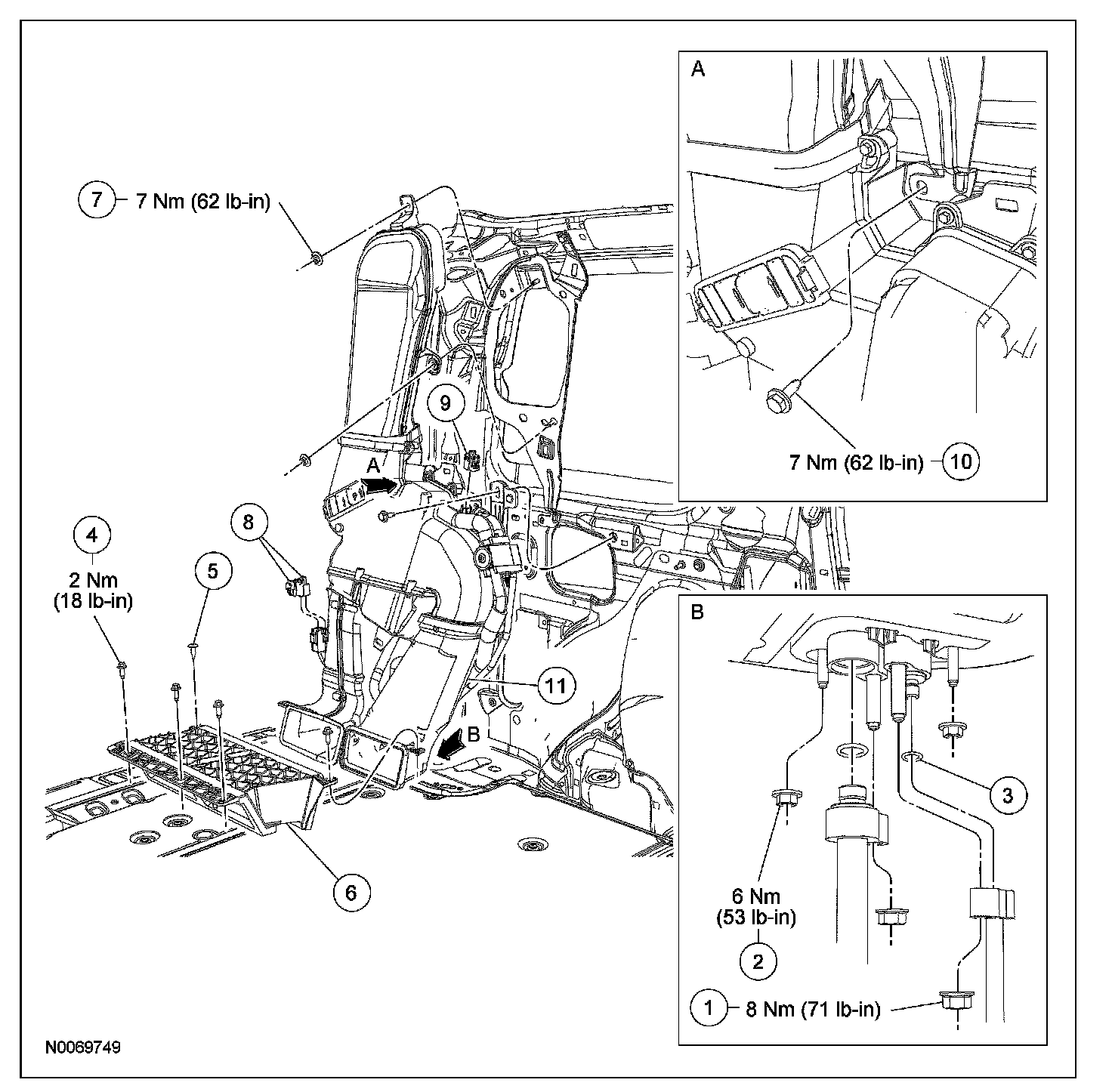 4. Remove the 2 auxiliary line floorpan bracket nuts.