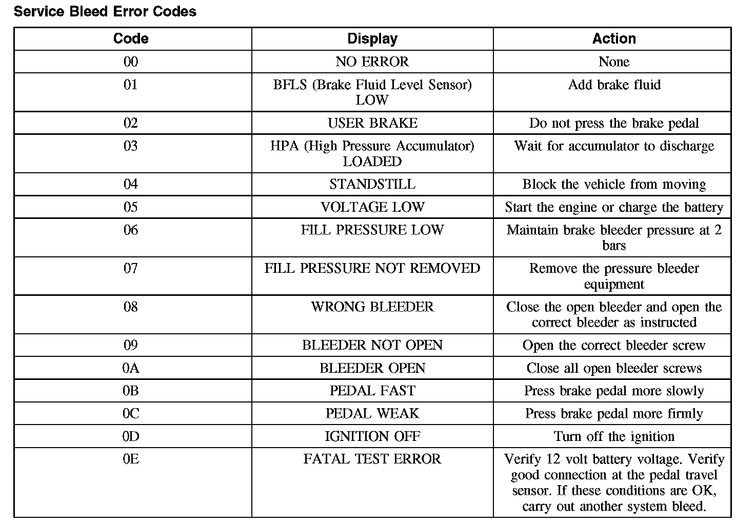 7. NOTE: The scan tool indicates when the service bleed procedure is not followed correctly. Continue with the service bleed procedure after correcting the condition. Refer to the Service Bleed Error Codes chart.