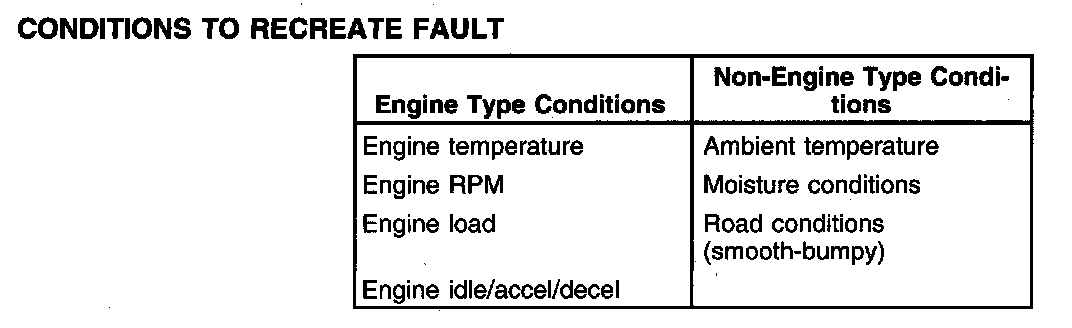 Recreating the fault is the first step in isolating the cause of the intermittent symptom. A thorough investigation should start with the customer information worksheet located in the back of the book. If freeze frame data is available, it may help in recreating the conditions at the time of a malfunction indicator lamp (MIL) diagnostic trouble code (DTC). Listed are some of the conditions for recreating the fault.