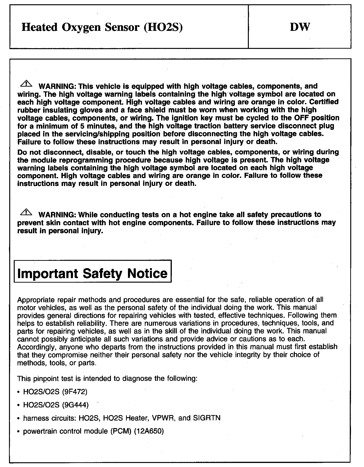PINPOINT TEST DW: HEATED OXYGEN SENSOR (HO2S)Warnings And Important Safety Notice: