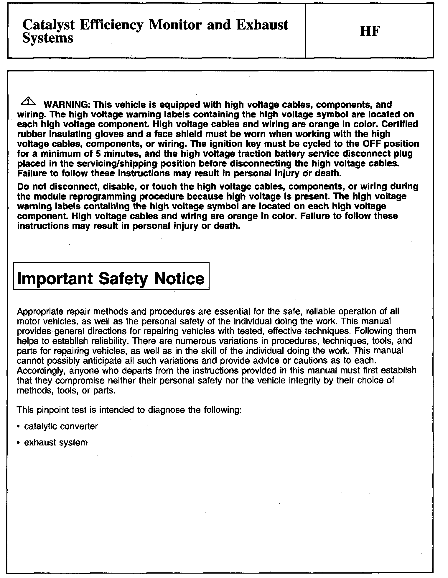 PINPOINT TEST HF: CATALYST EFFICIENCY MONITOR AND EXHAUST SYSTEMSWarning And Important Safety Notice: