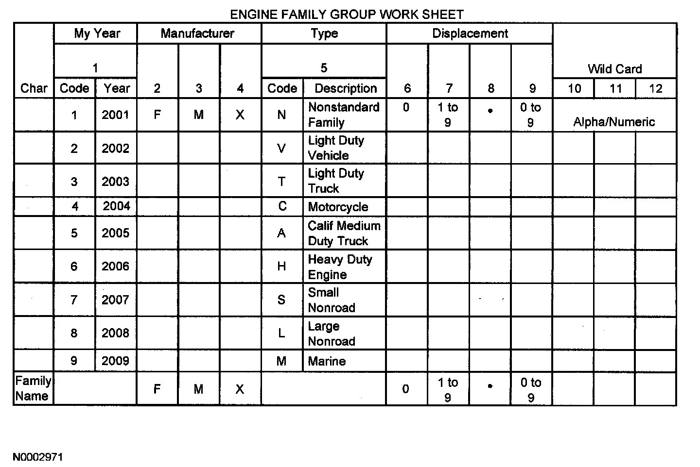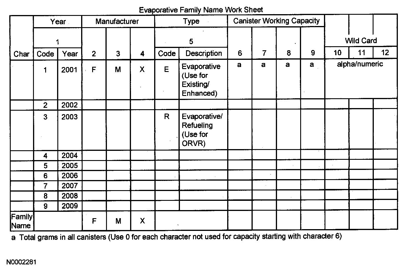 Both the engine family group and the evaporative family name are listed in the box on the emission decal as indicated in the area marked as engine evaporative family information. The first line contains the engine size and the 12-character engine family group. The second line contains the 12-character evaporative family name information. Both the engine family group and the evaporative family name are specific to the vehicle. Please refer to the Engine Family Group and the Evaporative Family Name work sheet for decoding information.