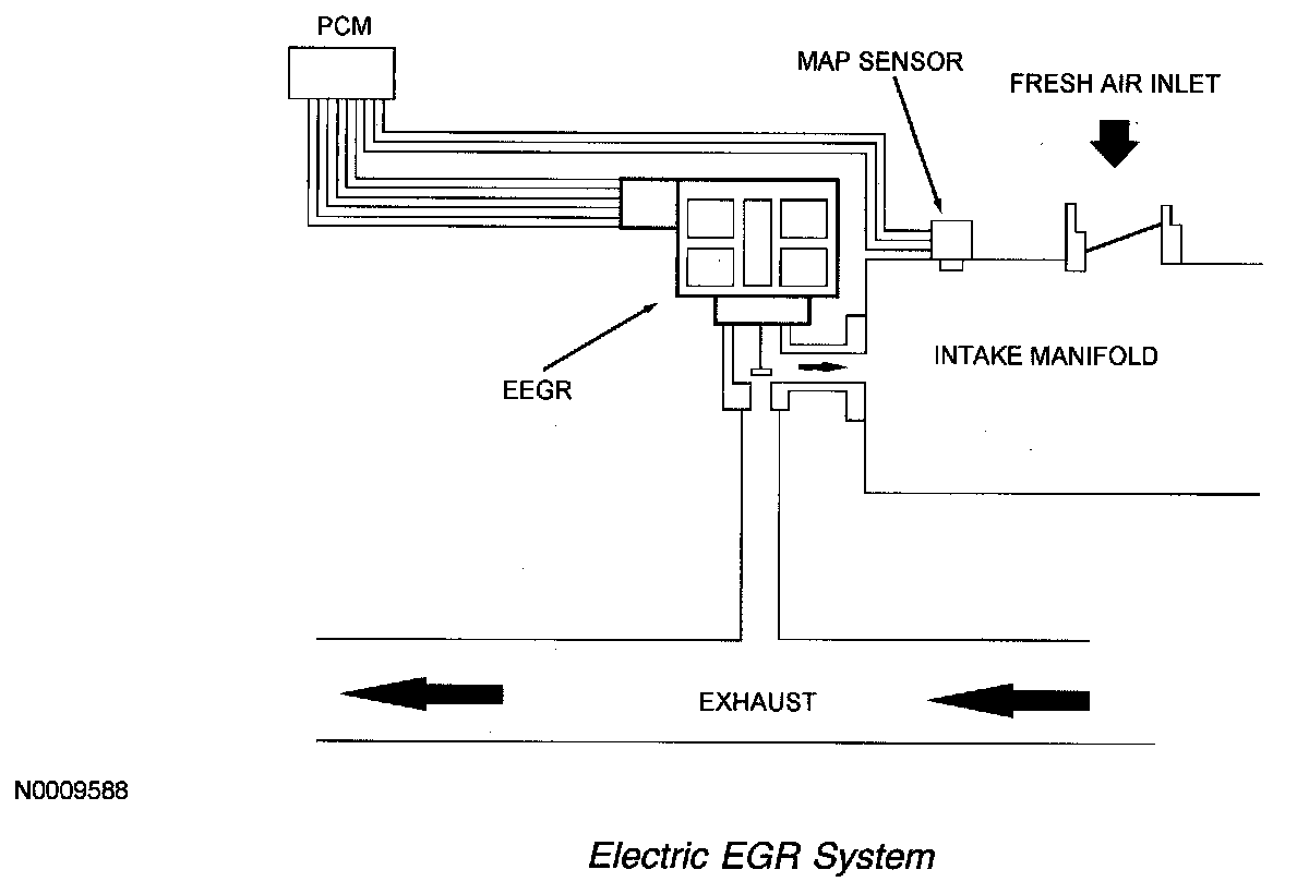 The EEGR system consists of an electric motor/EGR valve integrated assembly, the powertrain control module (PCM), and the connecting wiring. Additionally a MAP sensor is also required. Operation of the system is as follows:
