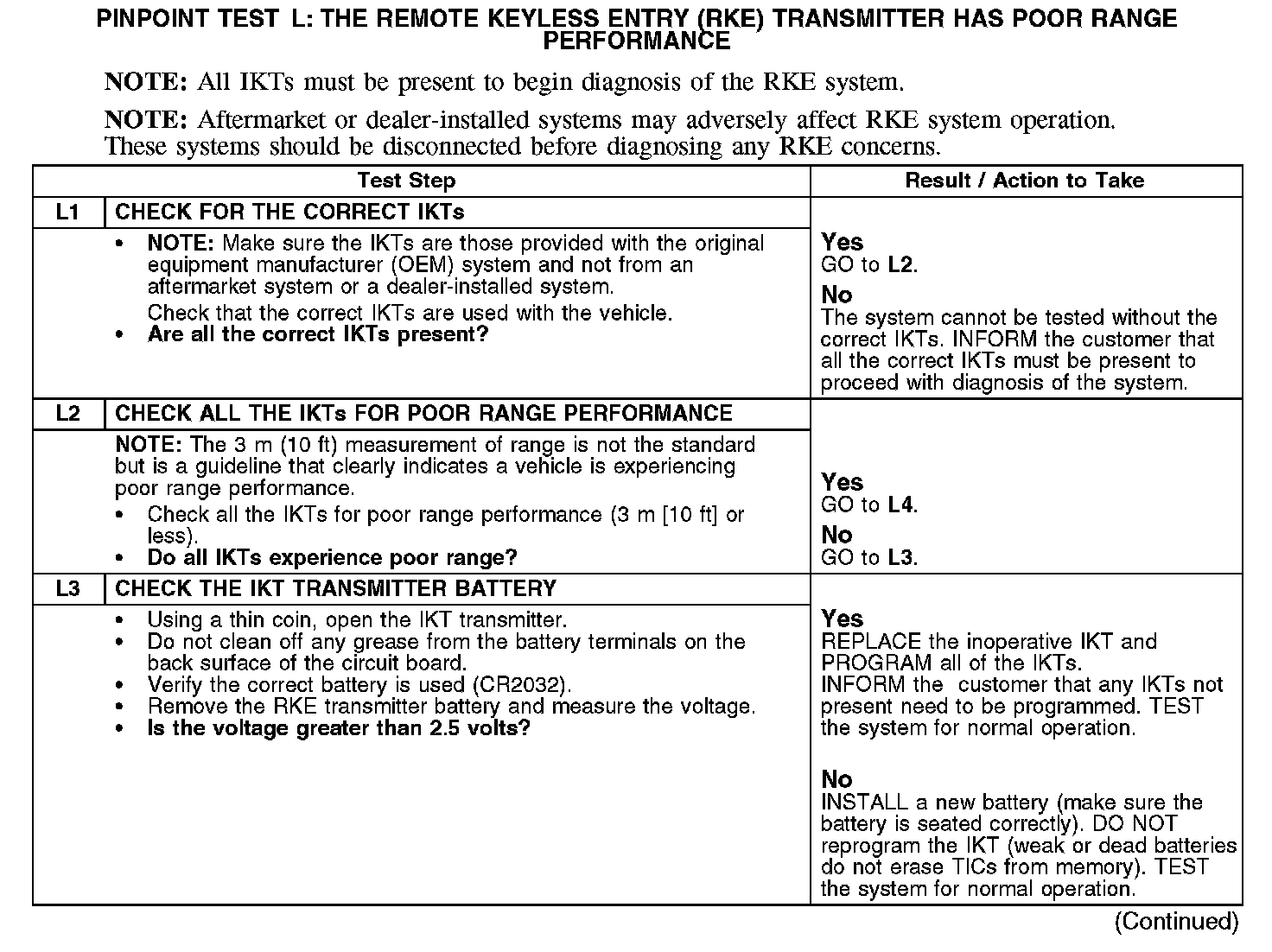PINPOINT TEST L: THE REMOTE KEYLESS ENTRY (RKE) TRANSMITTER HAS POOR RANGE PERFORMANCENormal Operation