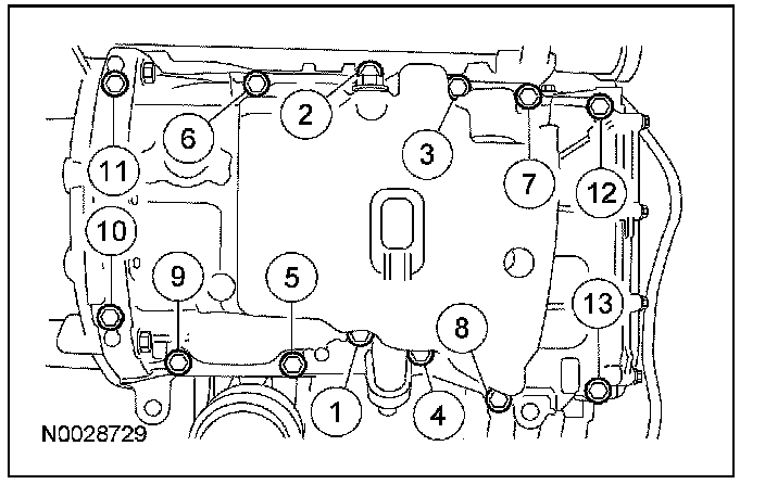 8. NOTE: If the oil pan is not secured within 10 minutes of sealant application, the sealant must be removed and the sealing area cleaned with metal surface cleaner. Allow to dry until there is no sign of wetness, or 10 minutes, whichever is longer. Failure to follow this procedure can cause future oil leakage.