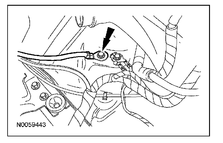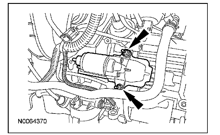 63. Remove the wire harness clip retainer and the ground wire from the starter bolts.