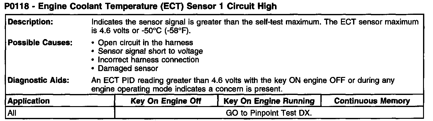 P0118 - Engine Coolant Temperature (ECT) Sensor 1 Circuit High: