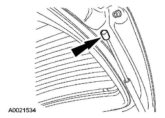 6. CAUTION: Plug washer hose after disconnecting. Damage to headliner will occur due to fluid leakage.