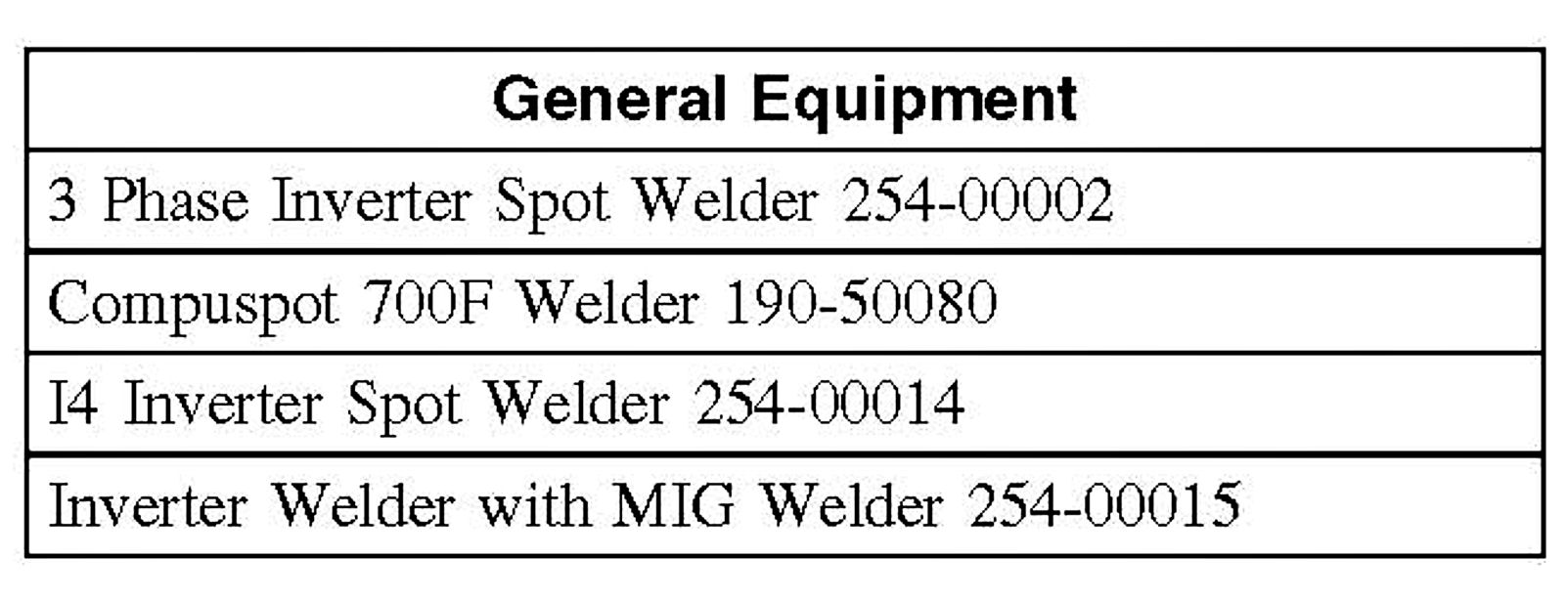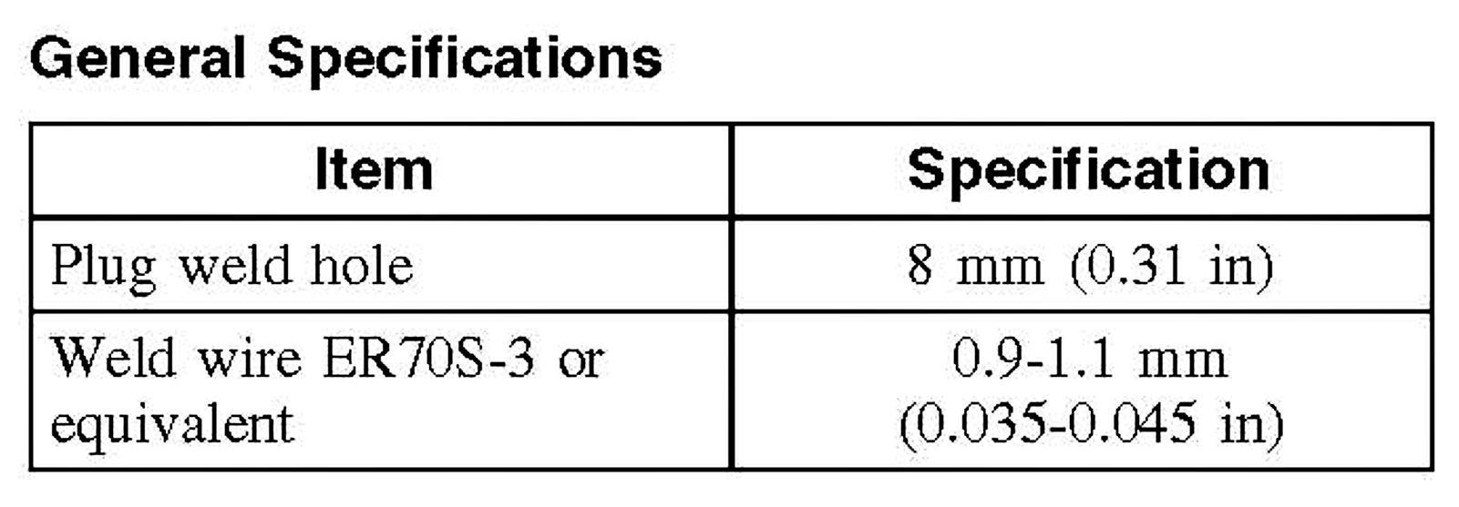 ^ Factory spot welds may be substituted with either STRW or MIG plug welds. Spot/plug welds should equal factory welds in both location and quantity. Do not place a new spot weld directly over an original weld location plug weld hole should equal 8 mm (O.31 in) diameter.