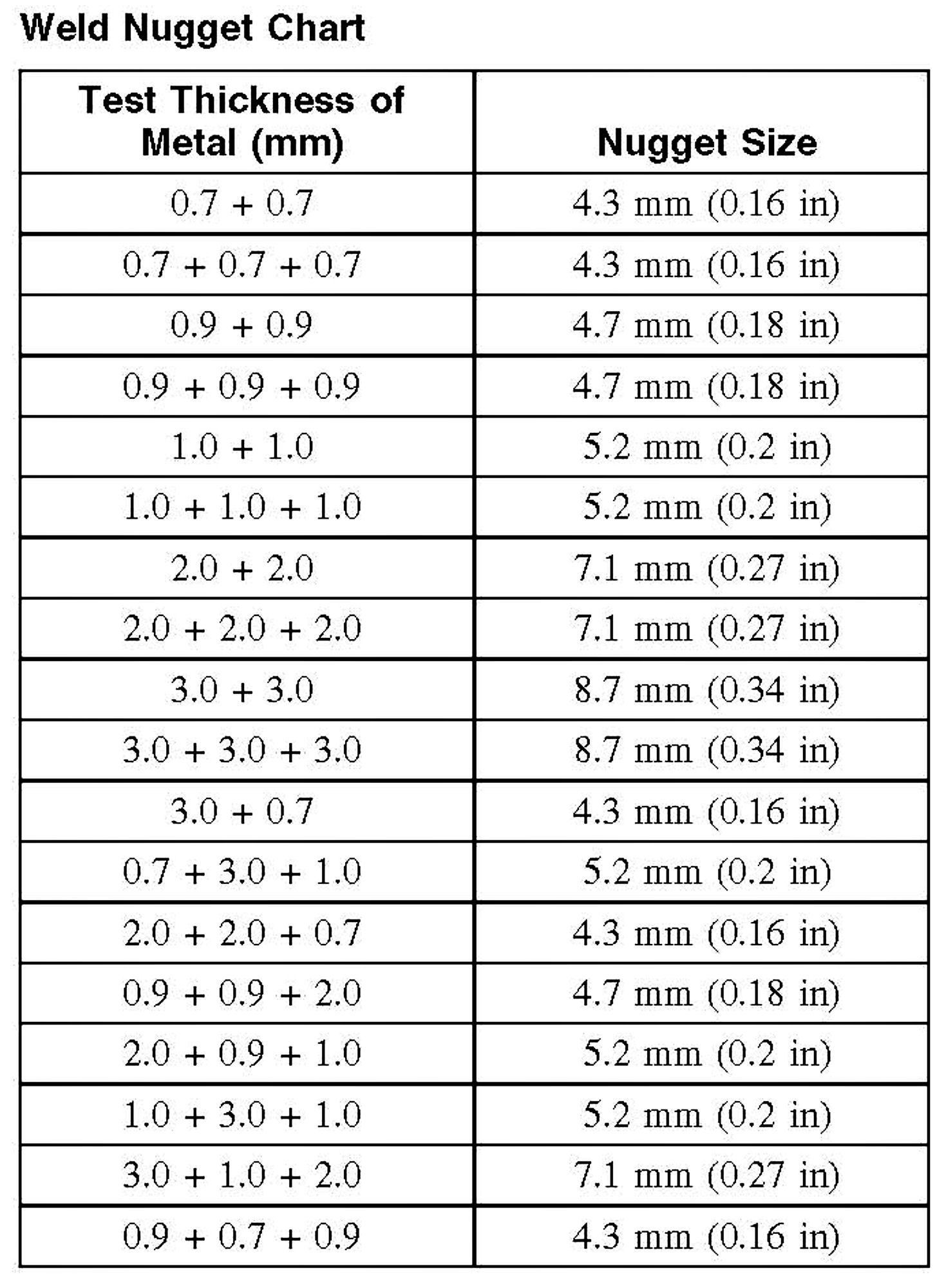 Weld Nugget Chart