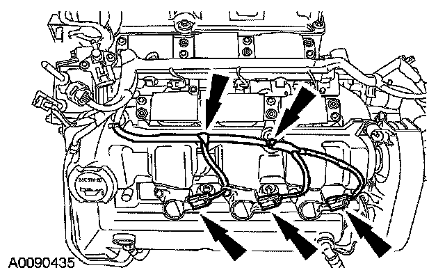 18. Disconnect the LH coil-on-plug electrical connectors and detach the wiring retainers.