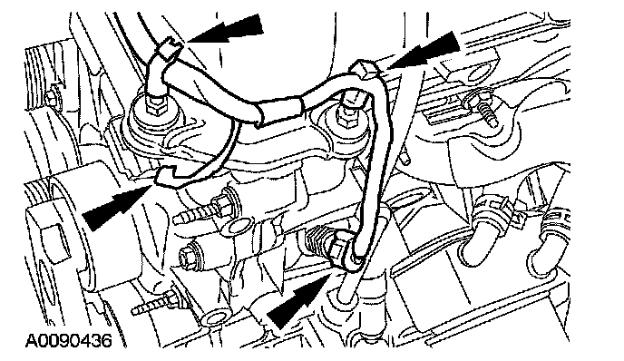 43. Disconnect the 2 hoses and remove the thermostat housing.
