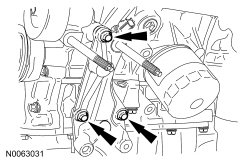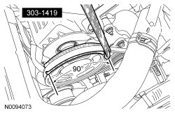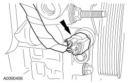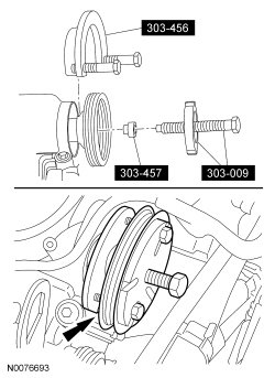 42. NOTICE: Failure to use the correct special tools, assembled as shown in the illustration, will result in damage to the coolant pump pulley and/or special tools.
