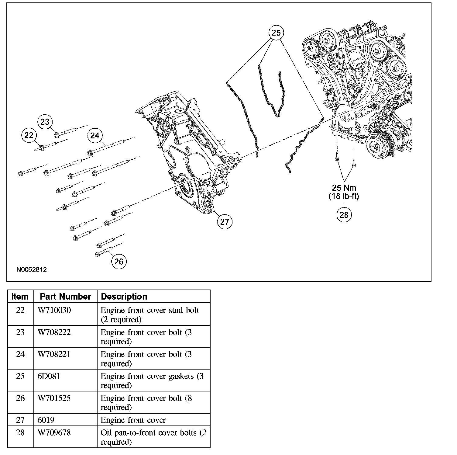 3. Position the engine front cover and install the bolts. Tighten in the sequence shown to 25 Nm (18 lb-ft).