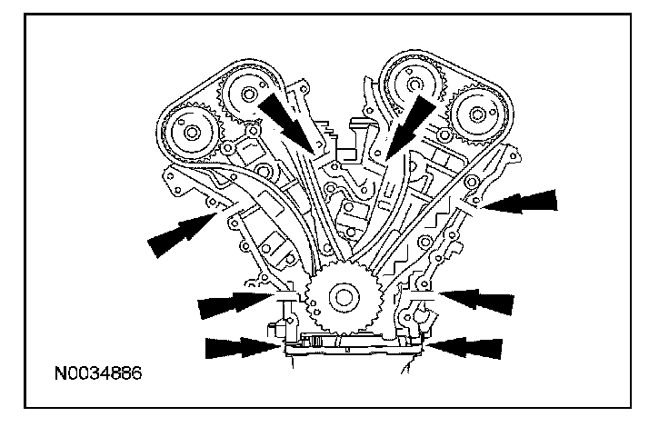 CAUTION: During engine repair procedures, cleanliness is extremely important. Any foreign material (including any material created while cleaning gasket surfaces) that enters the oil passages, coolant passages or the oil pan can cause engine failure.