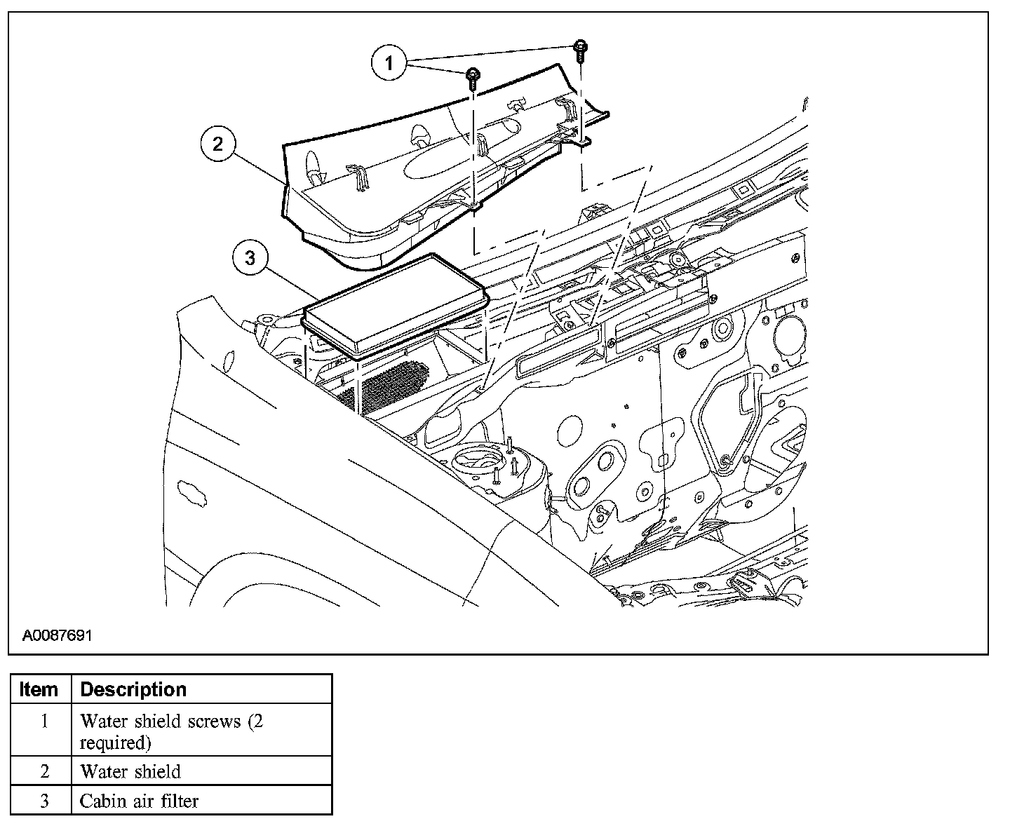 The accessory cabin air filter will be located in the air inlet under the right hand side of the cowl panel grill, if installed.