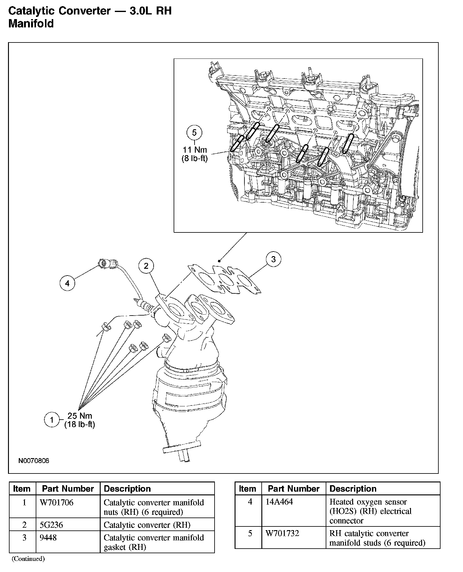 3. CAUTION: Failure to tighten the catalytic converter nuts to specification before installing the converter bracket bolts will cause the converter to develop an exhaust leak.