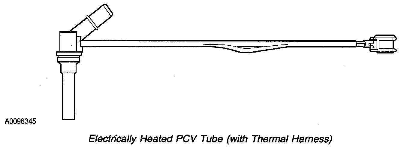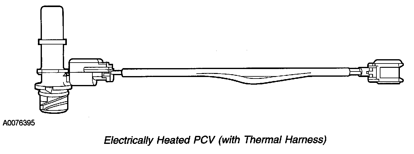 - Thermal harness controlled heater - On vehicle applications that are equipped with a thermal harness to the PCV valve or tube. The thermal harness only provides electrical continuity to the heating element when temperatures are less than 5°C ± 4°C (40°F ± 7°F). Typically this harness is located close to the PCV valve or tube.