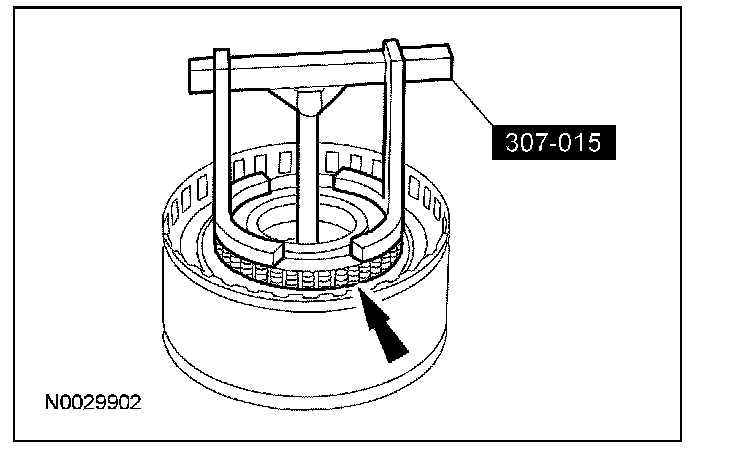 ^ Using the special tool, compress the reverse clutch return springs.