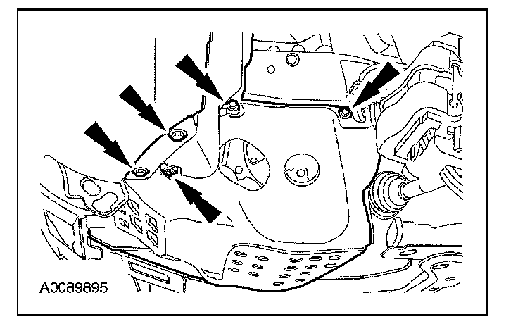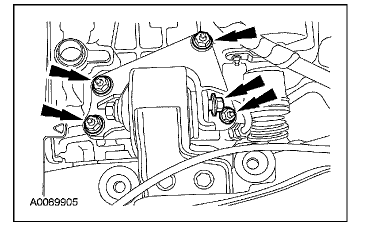 21. Loosen, but do not remove, the 4 retaining nuts holding the bracket to the transaxle case. Remove the LH upper transaxle mount bolt.