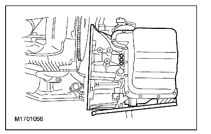 63. CAUTION: The torque converter is heavy. Install the special tool before lowering the transaxle.