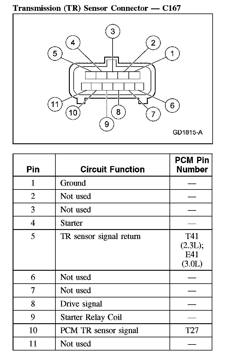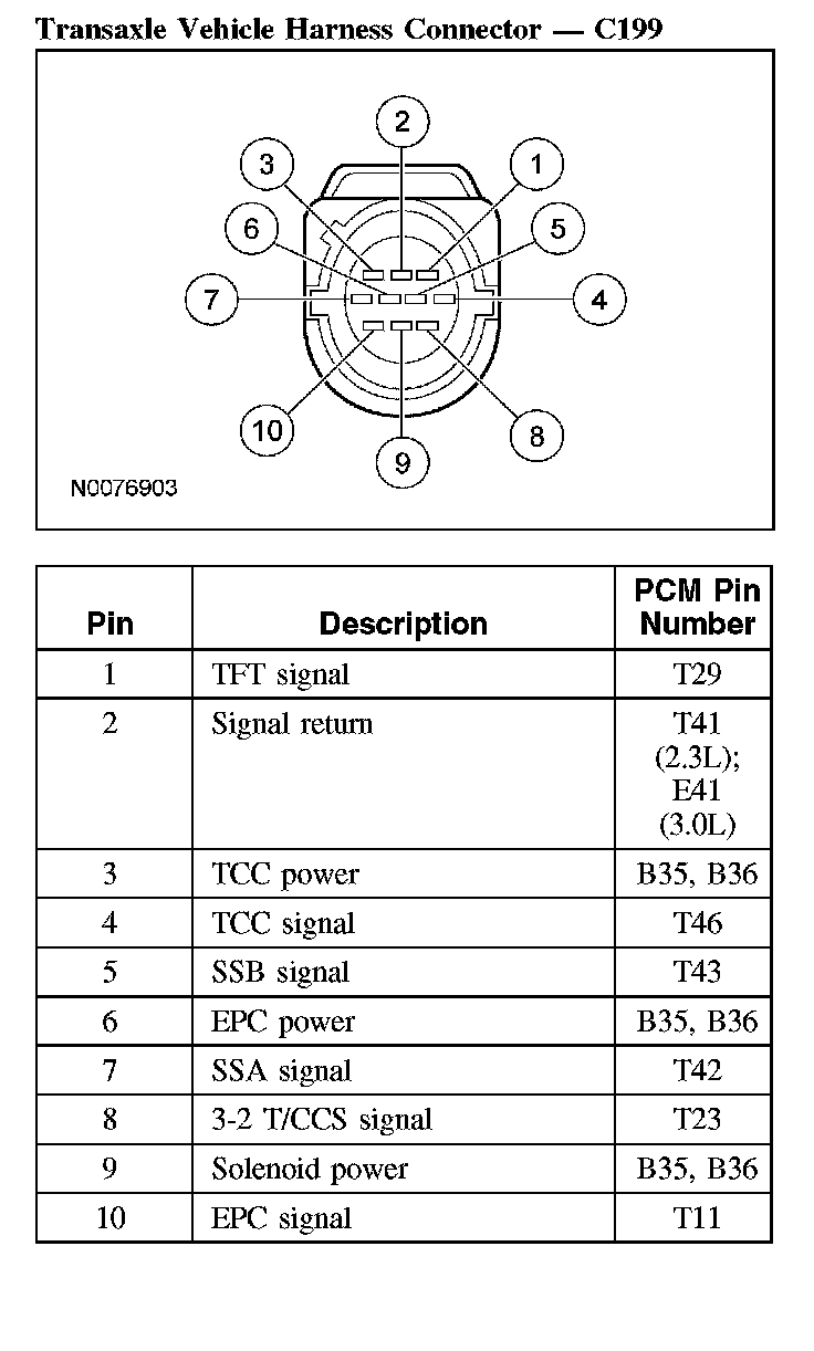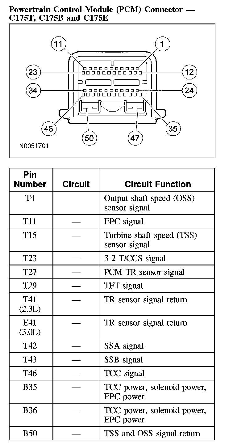 Transaxle Connector LayoutsNOTE: This vehicle is equipped with a new style PCM. This is a 50-pin control module with 3 separate connectors. One connector for the engine (E), one for the transaxle (T) and one for the body (B). The pin numbers listed throughout these pinpoint tests will have the letter E, T and B to designate the connector.