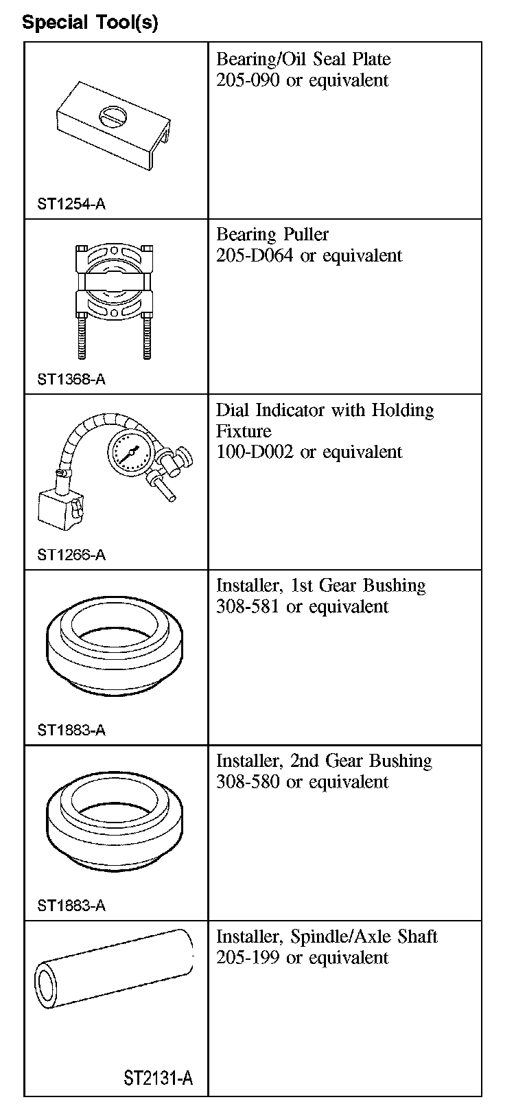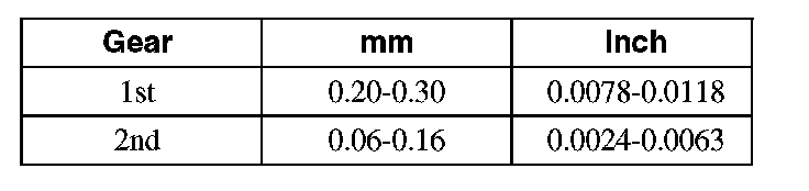 1. Prior to disassembly of the mainshaft, measure and record the end play for 1st and 2nd gears. Refer to the following chart for standard values: