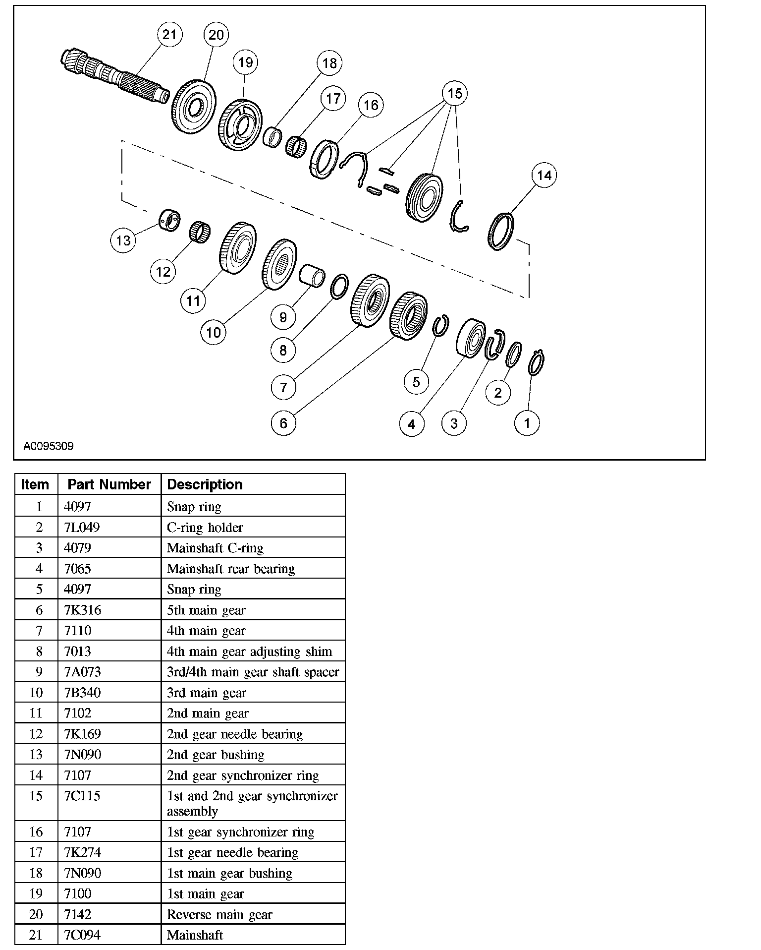 20. Measure the gap between the mainshaft C-ring and the mainshaft rear bearing. Refer to the following chart to select the appropriate C-ring thickness and install the C-ring: