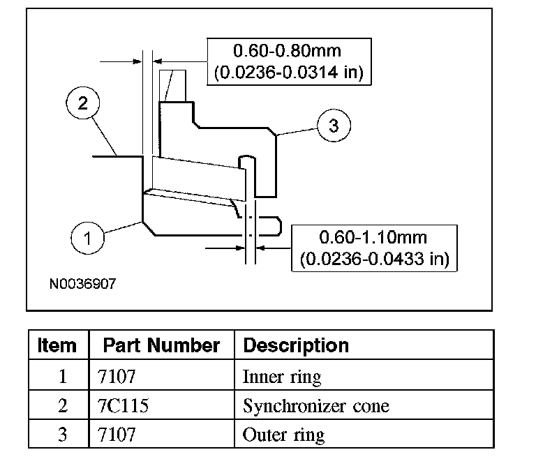 13. NOTE: The outer synchronizer ring, synchronizer cone and inner synchronizer ring have a set control clearance. If the measurement exceeds specification, install all 3 parts as a set.