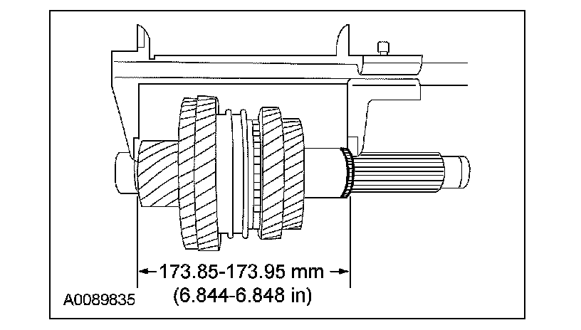 18. Measure the gap between the snap ring and the 5th main gear. The end play should be less than 0.1 mm (0.0039 in). Refer to the following chart to select the appropriate snap ring thickness and install a new snap ring: