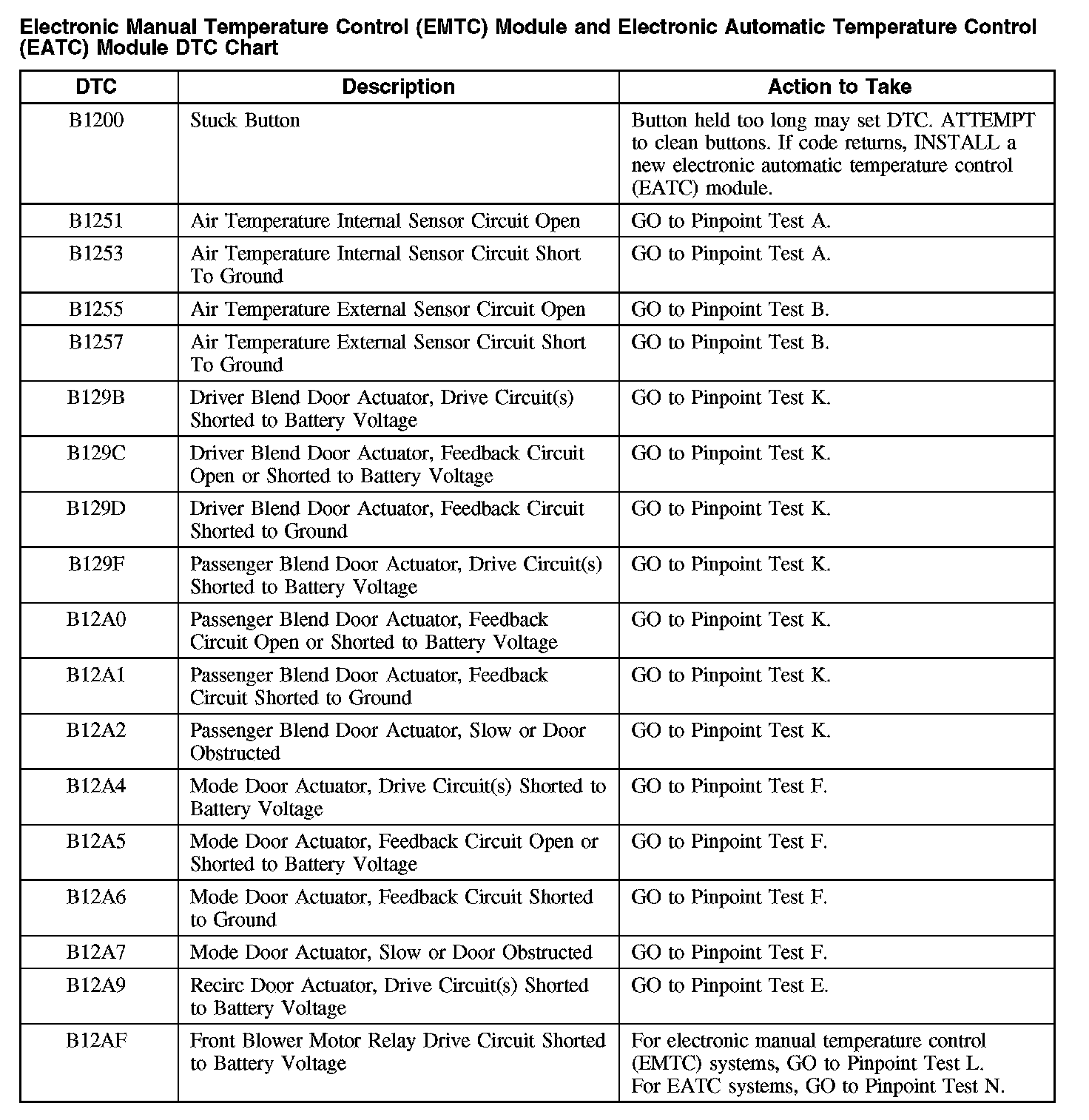 ELECTRONIC MANUAL TEMPERATURE CONTROL (EMTC) MODULE AND ELECTRONIC AUTOMATIC TEMPERATURE CONTROL (EATC) MODULE DTC CHARTNOTE: Some PCM DTCs may inhibit A/C operation. If any PCM DTCs are retrieved, diagnose those first. Refer to Computers and Control Systems.