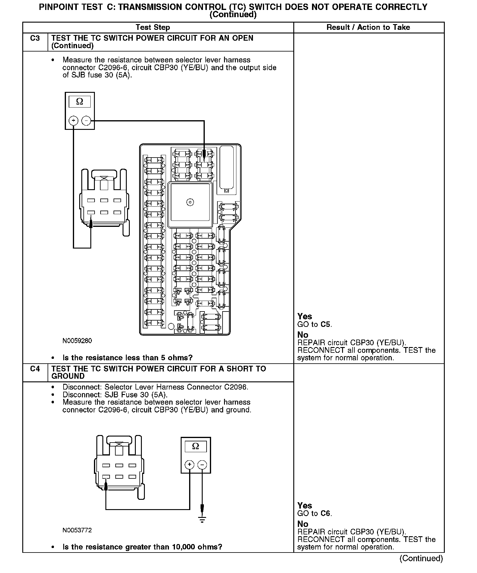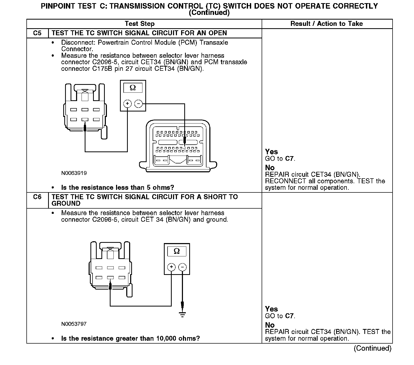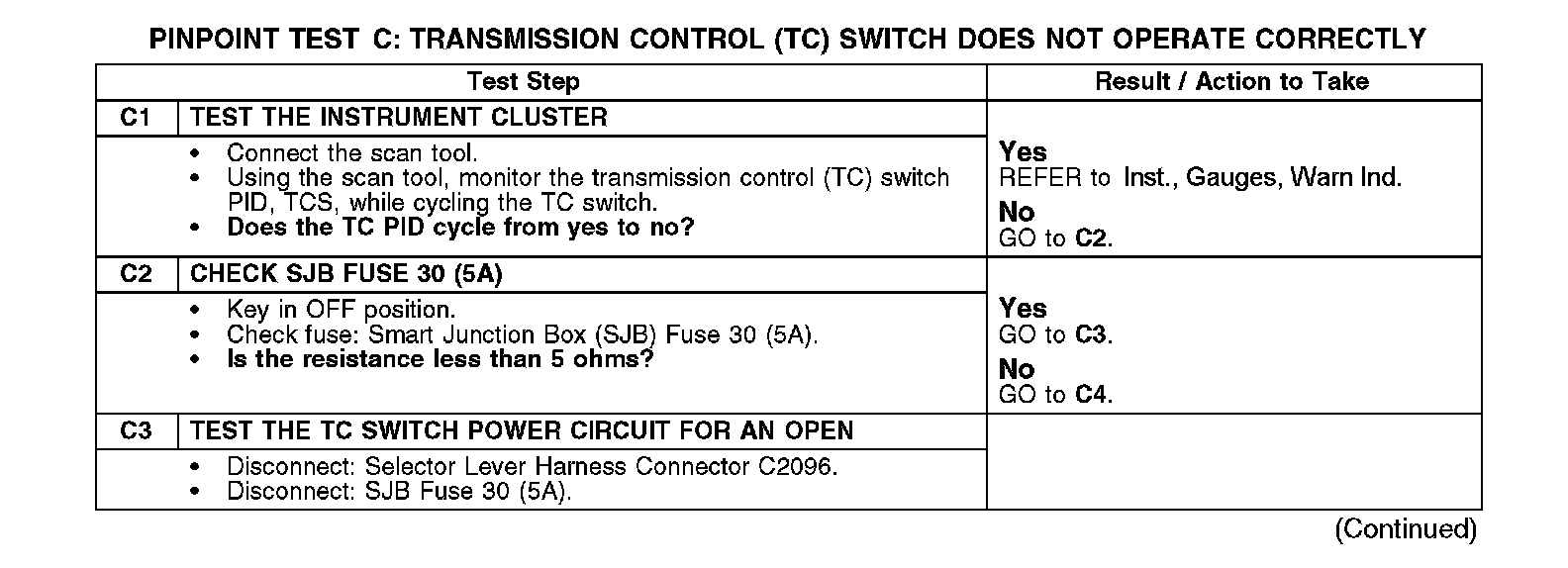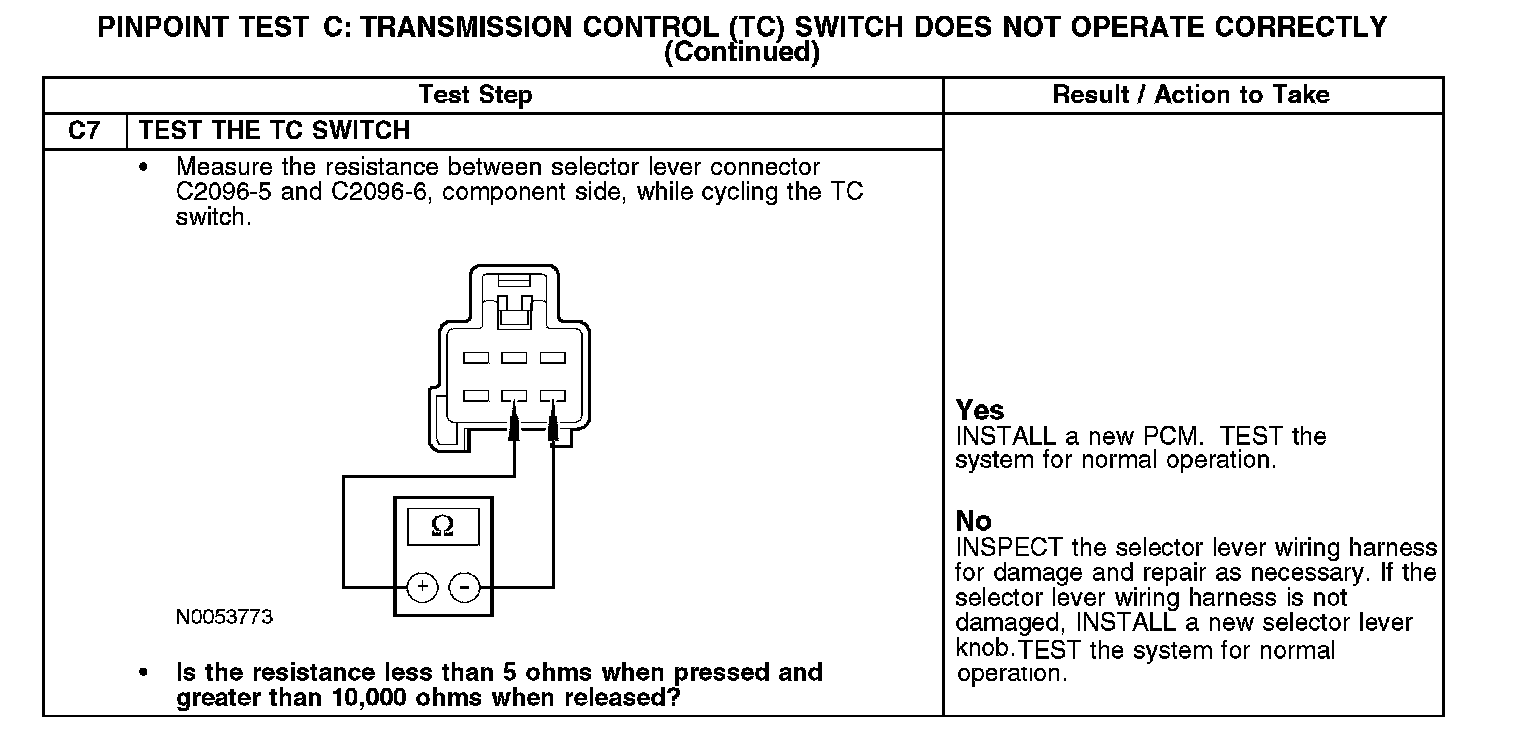 PINPOINT TEST C: TRANSMISSION CONTROL (TC) SWITCH DOES NOT OPERATE CORRECTLY