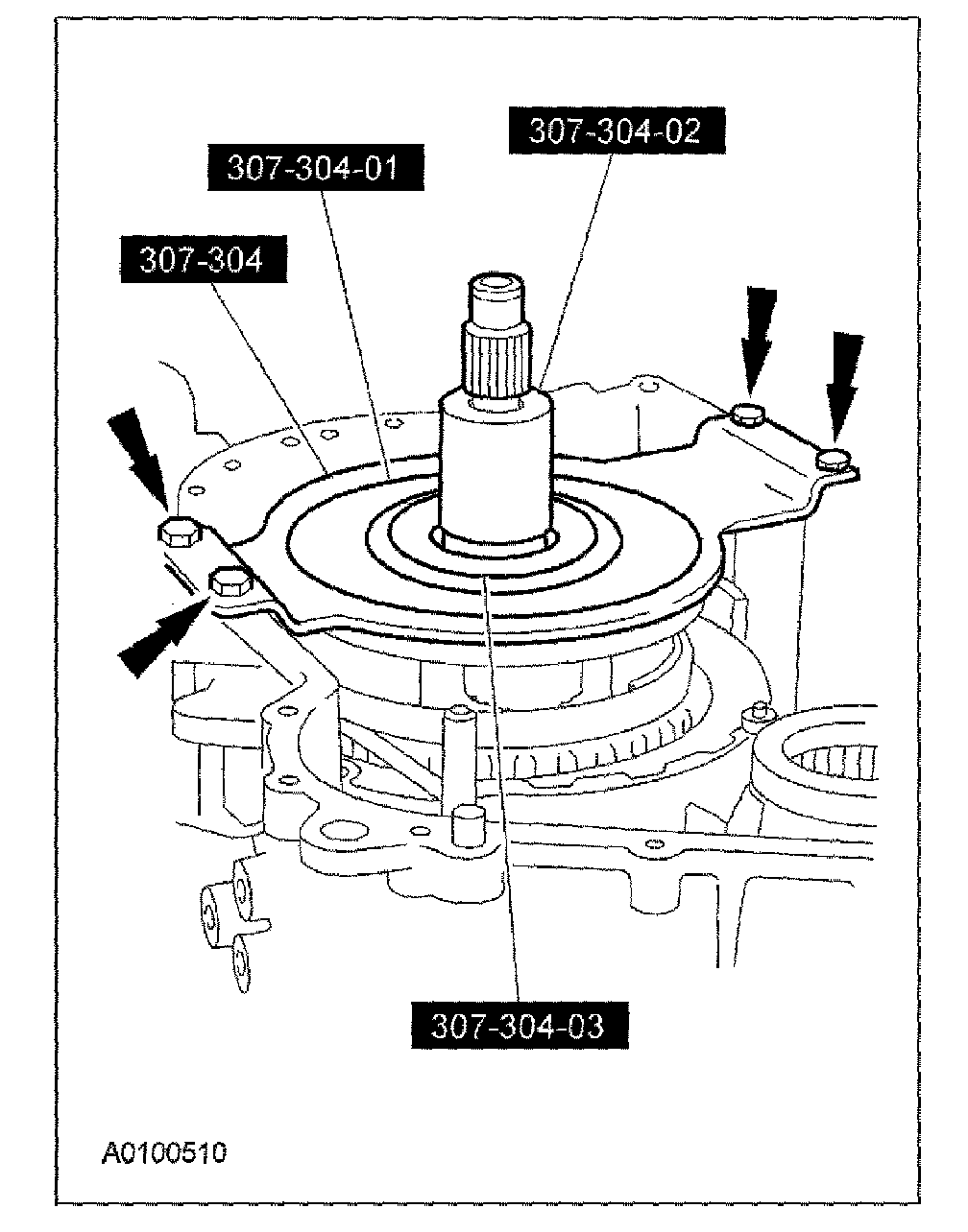 ^ Verify that the driven sprocket assembly and reverse/overdrive ring gear assembly are seated.