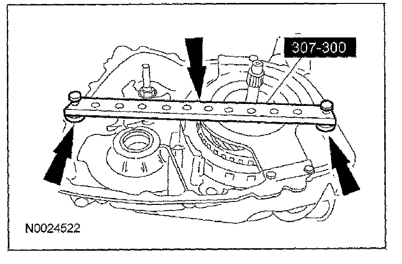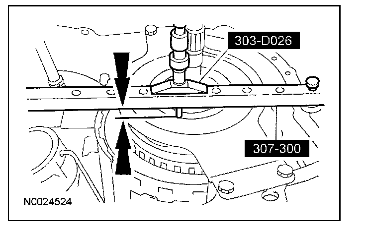 35. Using the special tools, measure the distance from the top of the special tool to the bearing surface on the reverse/overdrive carrier assembly on one side of the turbine shaft.