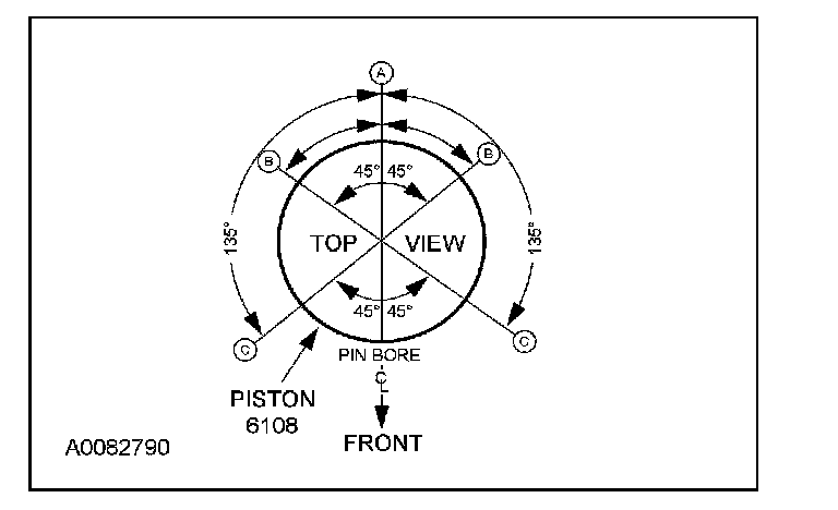 9. Make sure the ring gaps (oil spacer-A, oil ring-B, compression ring-C) are correctly spaced around the circumference of the piston.