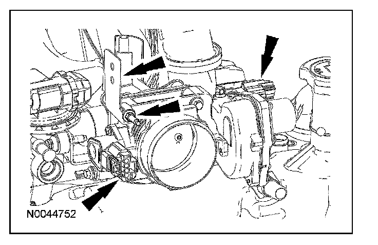 119. Connect the electronic throttle body (TB) and throttle position (TP) sensor electrical connectors. Attach the wiring harness bracket and install the nut.