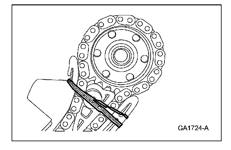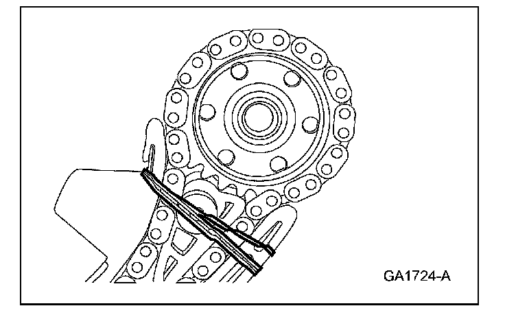 62. Remove the camshaft sprocket from the camshaft and install a rubber band on the cassette to hold the chain and camshaft sprocket in place.