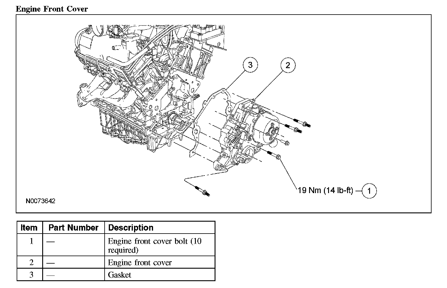 Remove the 10 bolts, the engine front cover and the gasket. Discard the gasket.
